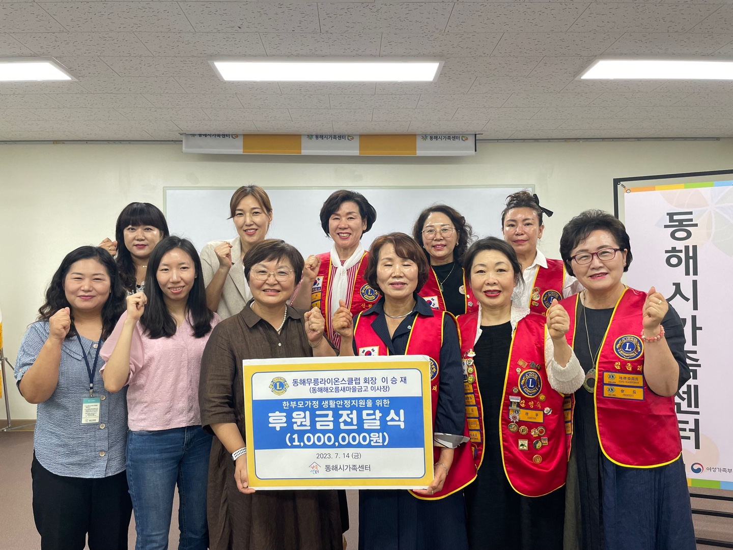 [강원사회복지신문 홍기한 기자]=동해시 가족센터(이하 '센터')에서는 지난 7월 14일(금) 센터1관 2층 교육장에서 동해무릉라이온스클럽 회장 이승재(해오름새마을금고이사장)님이 후원하는 한부모가정 생활안정지원을 위한 후원금(1,000,000원) 전달식을 가졌다고 밝혔다. 이번에 전달된 후원금은 동해시 거주 한부모가정에...