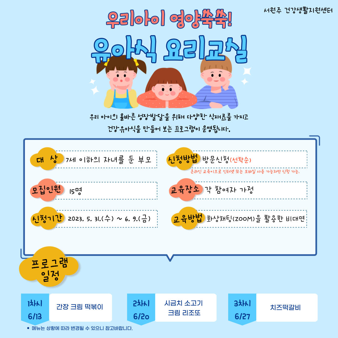 [강원사회복지신문 서은진 기자]=선착순 15명 모집, 오는 6월 9일까지 서원주 건강생활지원센터 방문 접수 서원주 건강생활지원센터는 6월 13일부터 유아의 건강한 식습관 형성을 위한 '우리아이 영양쑥쑥 요리교실'을 운영한다. 이번 교육에서는 우리 아이의 올바른 성장 발달을 위해 다양한 식재료를 가지고 건강 유아식을...