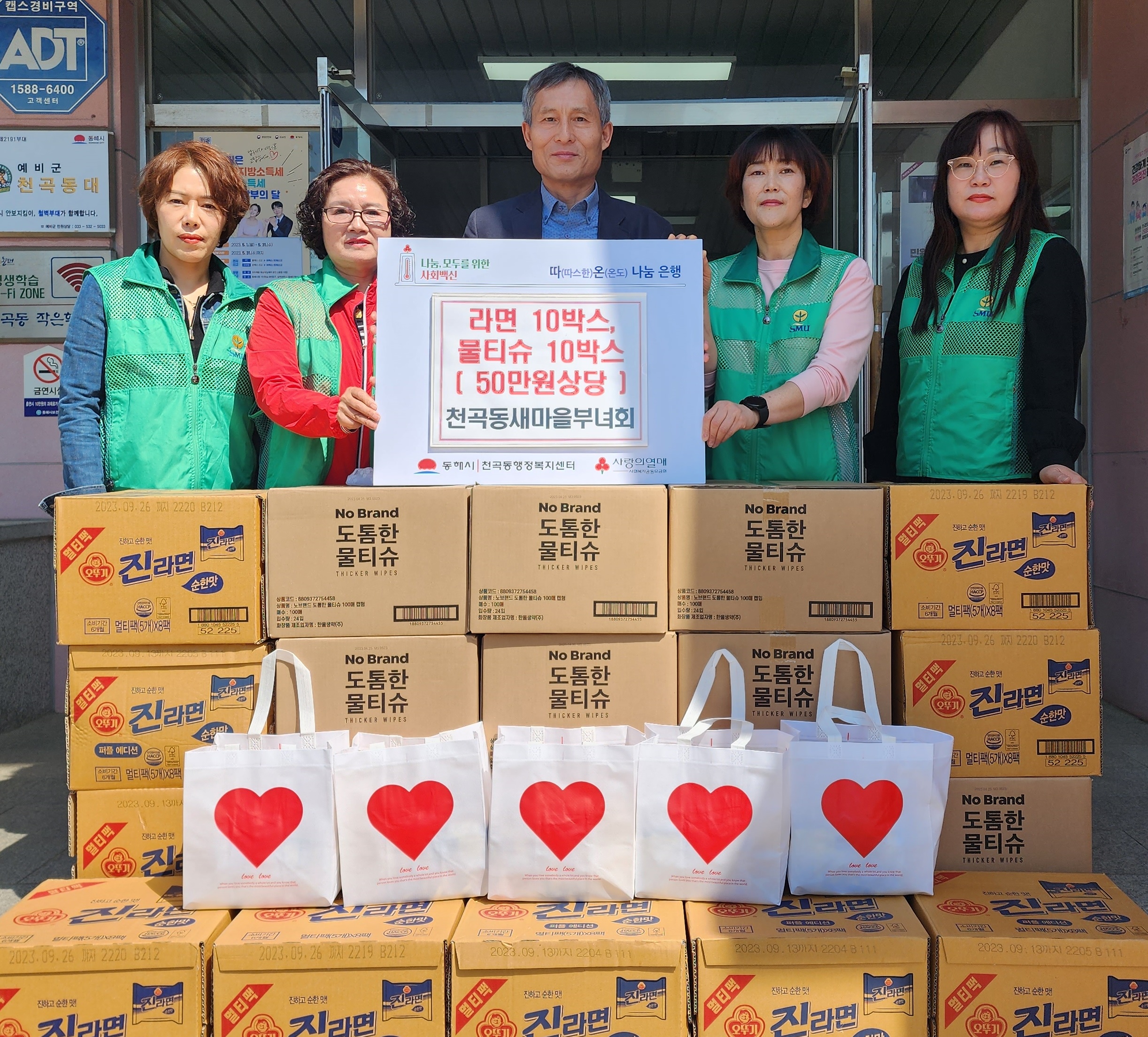 [강원사회복지신문 김종한 기자]=동해시 천곡동 새마을부녀회(회장 진복남)는 지난 5월 3일 천곡동행정복지센터를 방문, 50만원 상당의 물티슈와 라면을 기탁하며 어려운 이웃을 위한 따뜻한 마음을 전했다. 이날 전달된 후원물품은 지난 3월 천곡동 전통민속 윷놀이 행사에서 새마을부녀회 회원들이 아나바다 장터를 열어 얻...