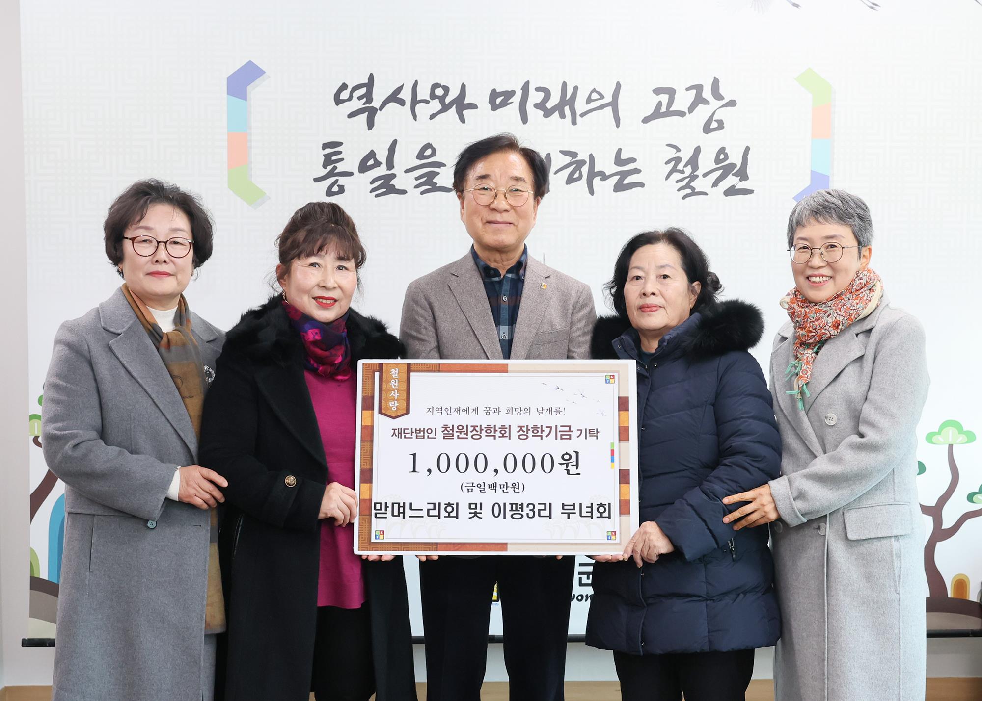 맏며느리회(회원 최계숙, 홍재옥) 및 이평3리 부녀회(회장 이영미) 는 지난 2월 14일 철원장학회에 장학기금 100만원을 기탁했다.