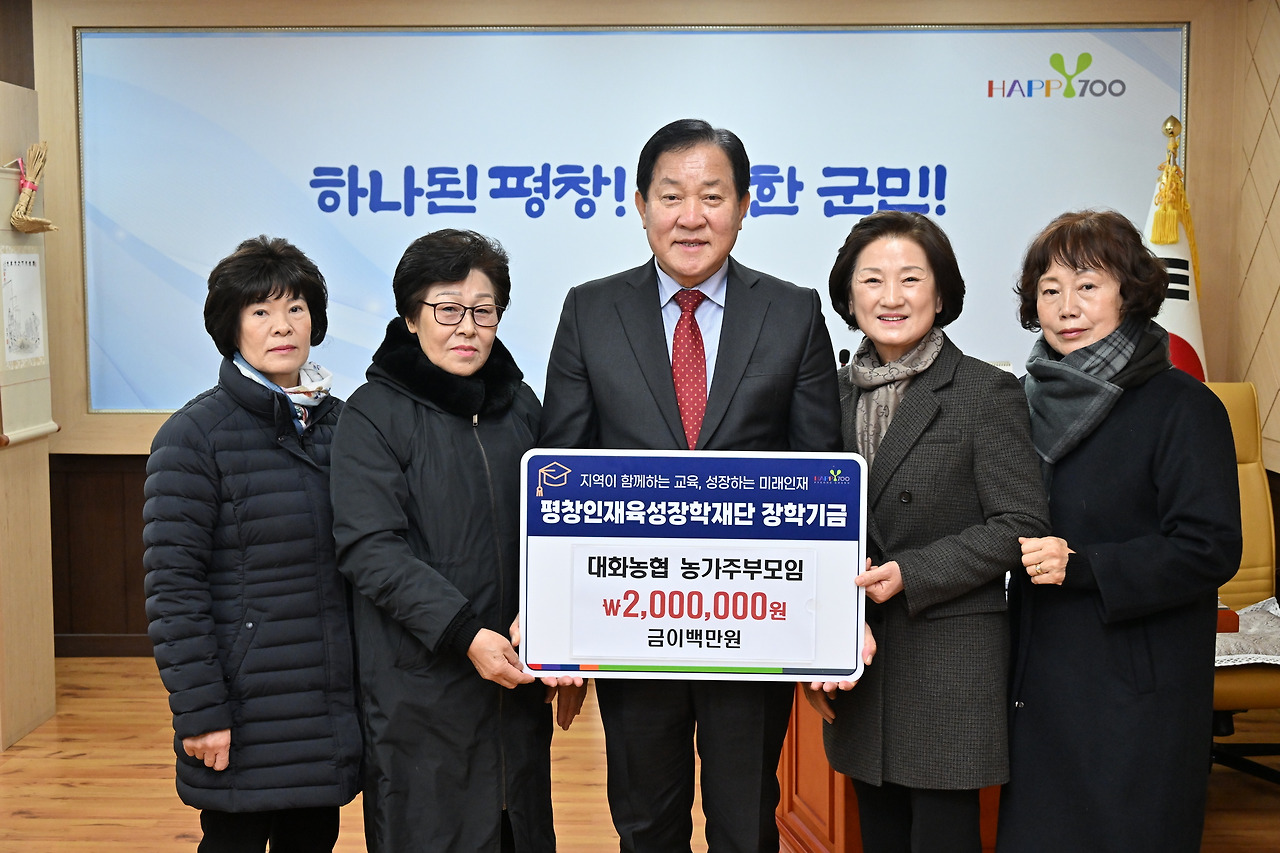 평창군 대화농협 농가주부모임(회장 윤복선)은 1월 20일 지역의 인재 양성을 위해 평창인재육성장학재단에 장학기금 200만원을 기탁하였다.