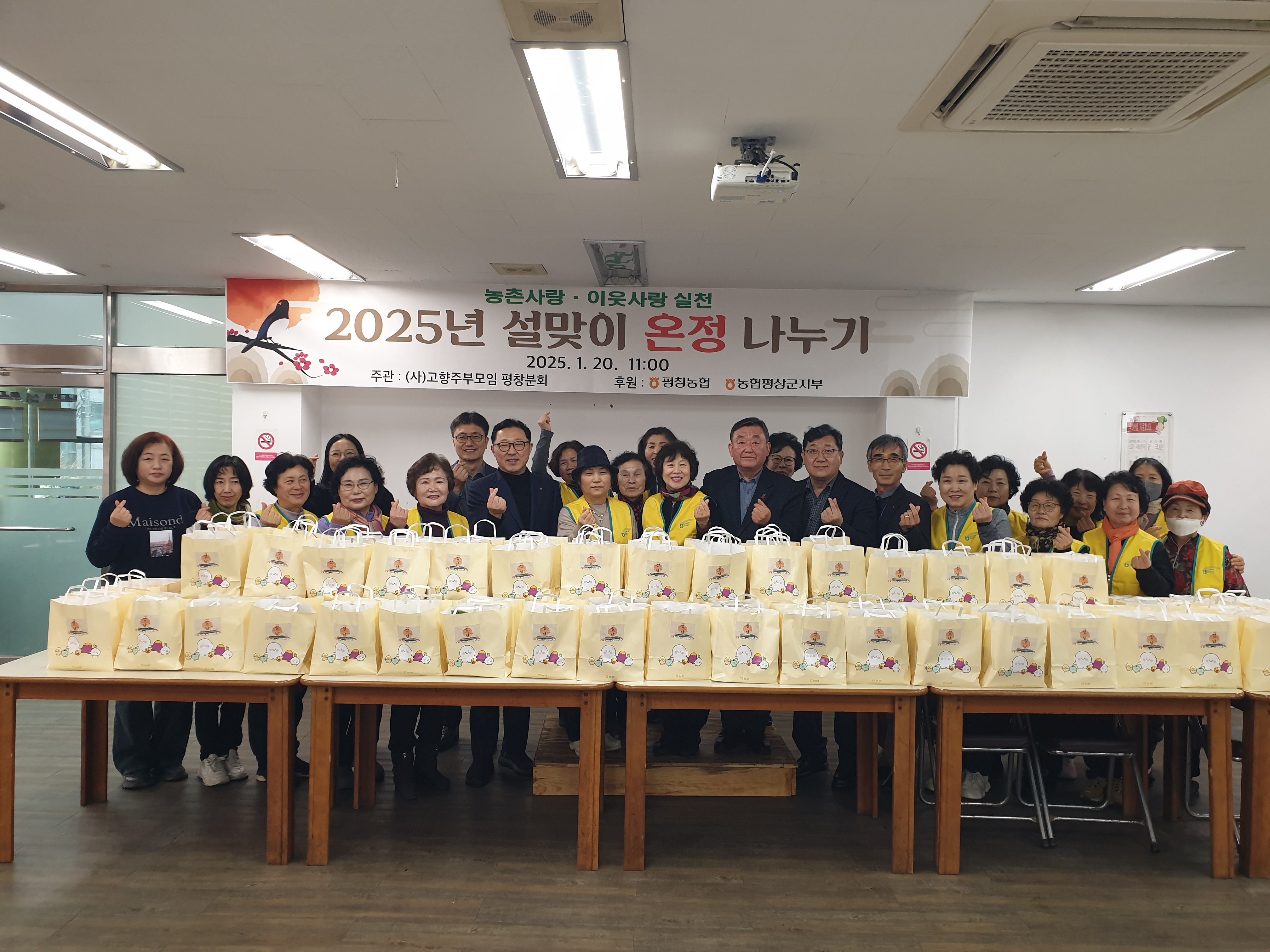 평창농협(조합장 이만재), 농협평창군지부(지부장 김태윤), (사)고향주부모임 평창분회(회장 송은숙)은 1월 20일 오전 평창농협 2층 대회의실에서 관내 취약농가를 대상으로 을사년 새해 설날 맞이 온정 떡국떡 꾸러미 나눔활동을 실시하였다.
