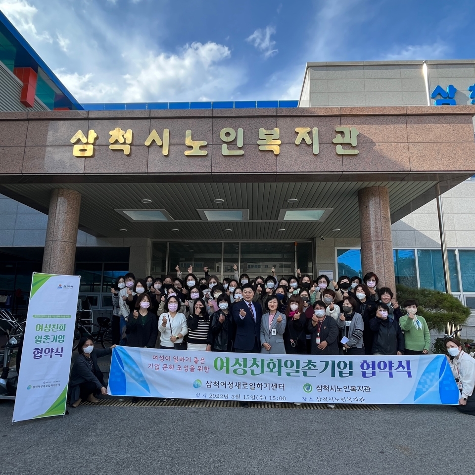 [강원사회복지신문 김종한 기자]=삼척여성새로일하기센터에서는 지난 3월 15일 15시 삼척시노인복지관과 경력단절여성 및 미취업 여성들의 취업 기회 확대 및 여성이 일하기 좋은 일터 조성을 위한 '여성친화 일촌기업 협약식'을 삼척시노인복지관에서 가졌다. 이번 협약식에는 삼척시노인복지관 소속 생활지원사 50명이 참석...