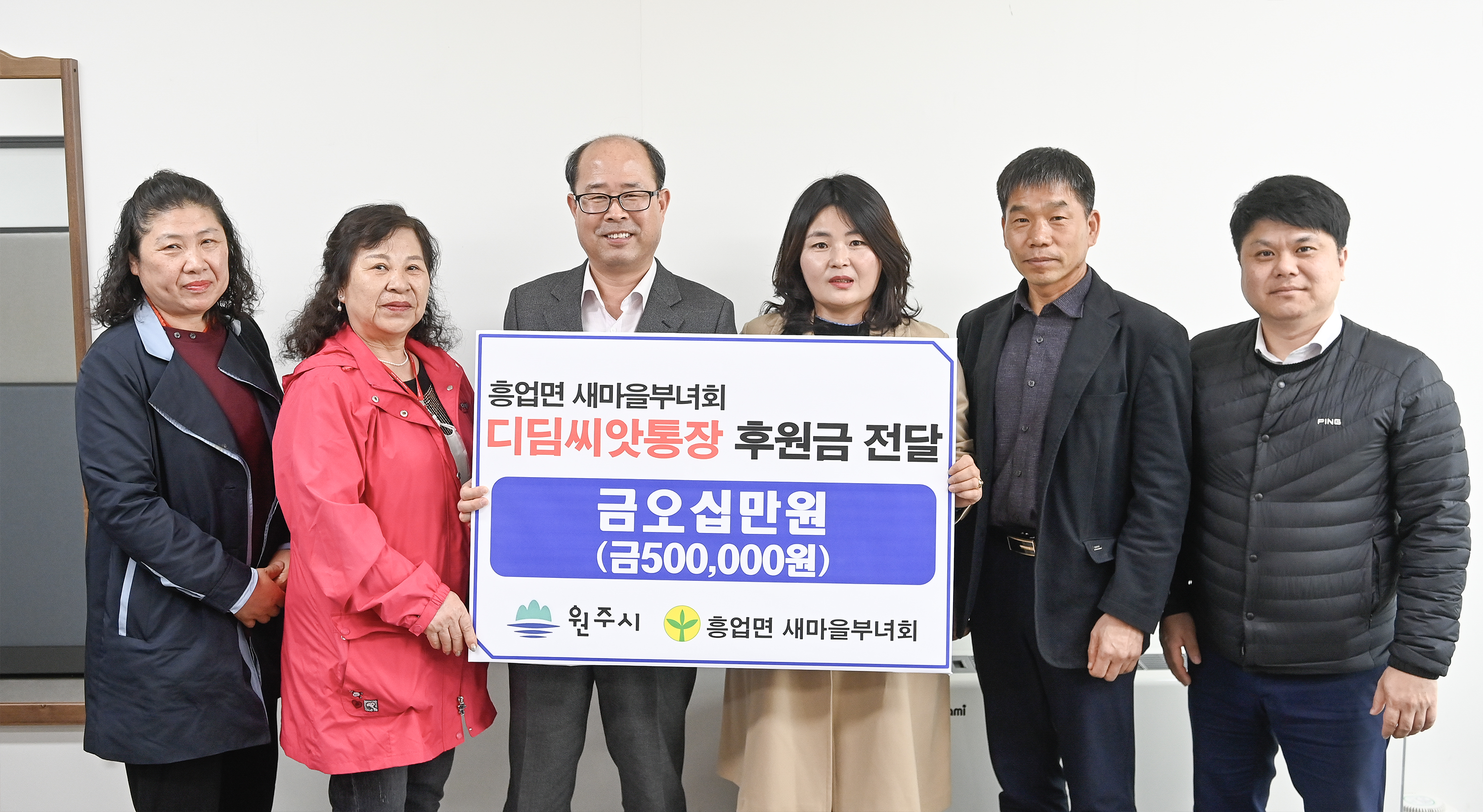 [강원사회복지신문 서은진 기자]=원주시 흥업면 새마을부녀회(회장 임명희)는 지난 3월 9일 원주시청 복지국장실에서 디딤씨앗통장 적립 후원금 50만 원을 전달했다. 흥업면 새마을부녀회의 활동 수익금으로 마련한 이번 후원금은 아동권리보장원을 통해 경제적으로 어려운 기초생활수급자와 요보호아동 50명에게 1인당 1만 ...
