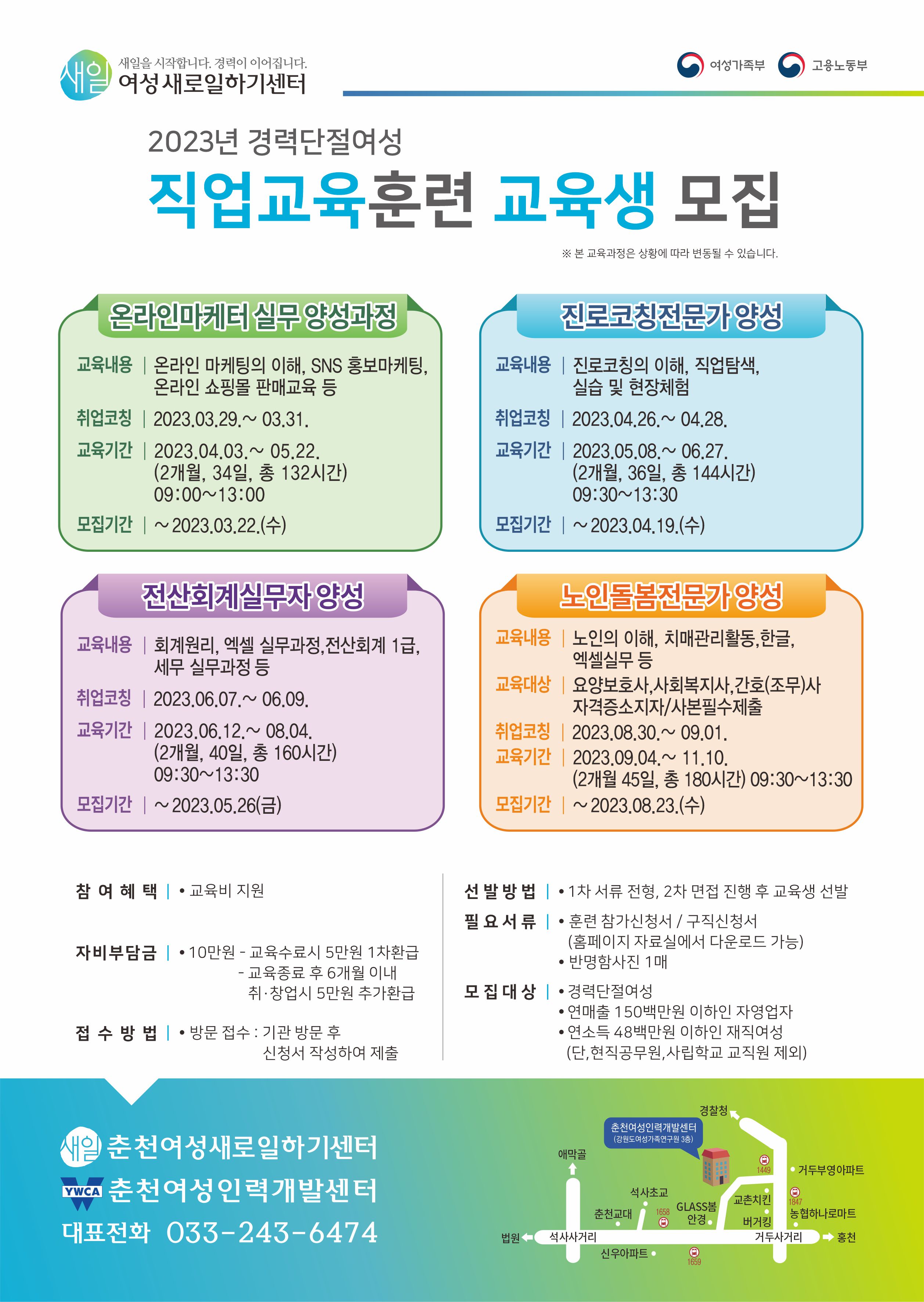 [강원사회복지신문 서은진 기자]=춘천여성인력개발센터·춘천시여성새로일하기센터(관장 이기자)에서는 '2023년 경력단절여성 직업교육훈련'을 진행한다. 이 교육을 통해 여성 맞춤형 전문인력 60명을 양성하겠다는 계획이다. 여성가족부 국비지원으로 진행하는 직업교육 훈련은 경력단절여성의 직업능력개발을 통한 취업역량...