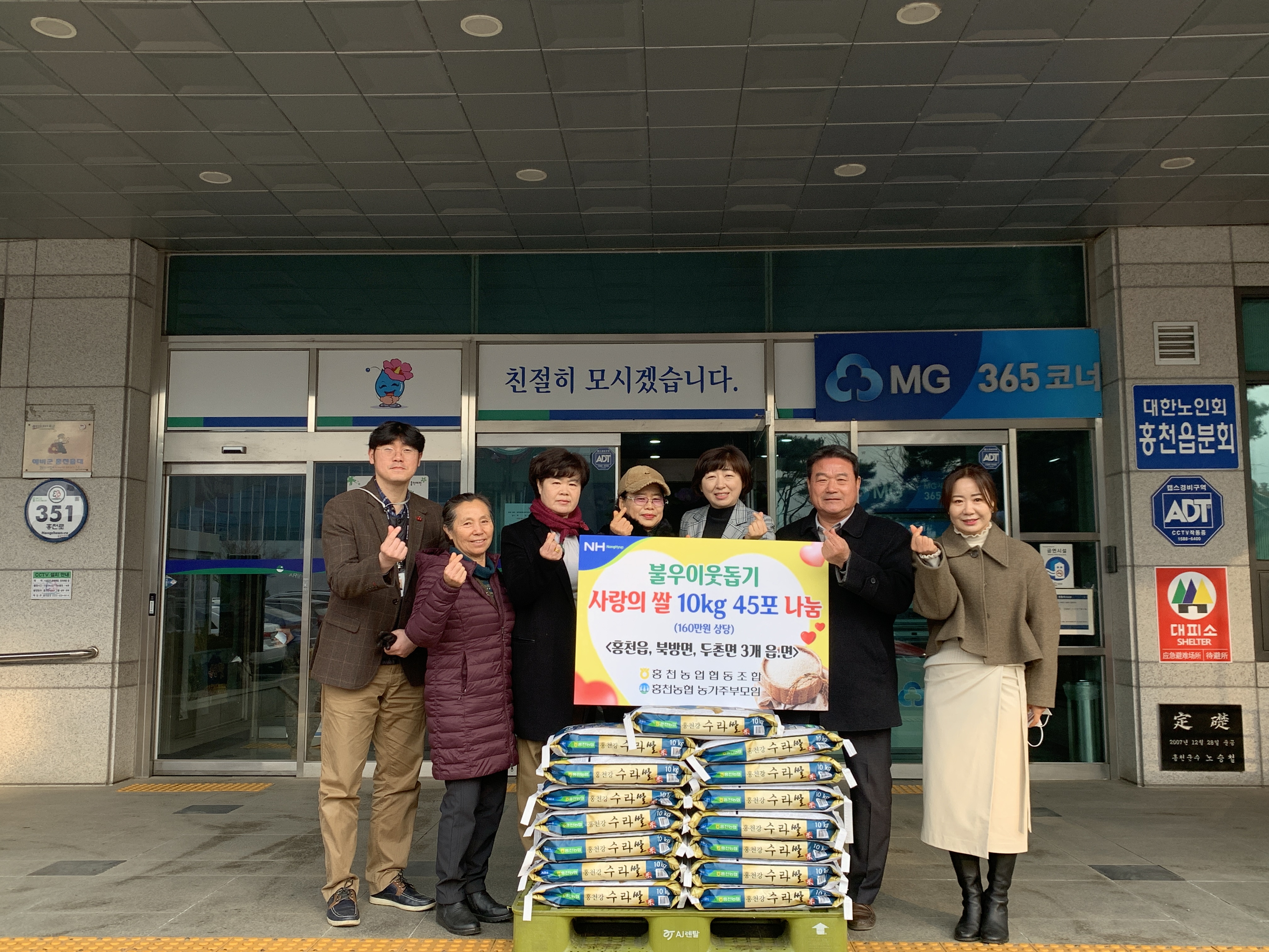 [강원사회복지신문 김도연 기자]=홍천농협 농가주부모임은 지난 2월 7일 홍천읍행정복지센터를 방문해 60만원 상당의 쌀(10kg) 15포를 기탁했다. 이날 기탁식에는 홍정옥 농가주부모임회장, 심금화 홍천읍장, 심영주 홍천농협조합장 및 농가주부모임단회원이 참석했다. 홍정옥 회장은 "어려운 이웃들이 조금이나마 즐겁고 따...