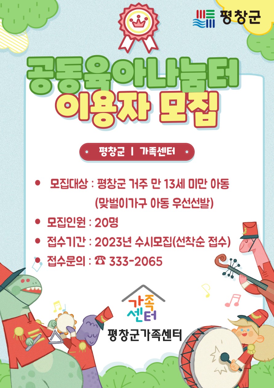 [강원사회복지신문 이정환 기자]=평창군이 올해도 돌봄공백을 메꾸기 위해 공동육아나눔터 이용자를 모집한다. 공동육아나눔터는 아동의 건강한 성장 발달을 지원하고 부모의 양육 부담을 경감시키는 등 가정육아 활성화를 위한 시설이다. 만 13세 미만 아동을 대상으로 오전 10시부터 오후 7시까지 주중 상시 개방하며, 취학...