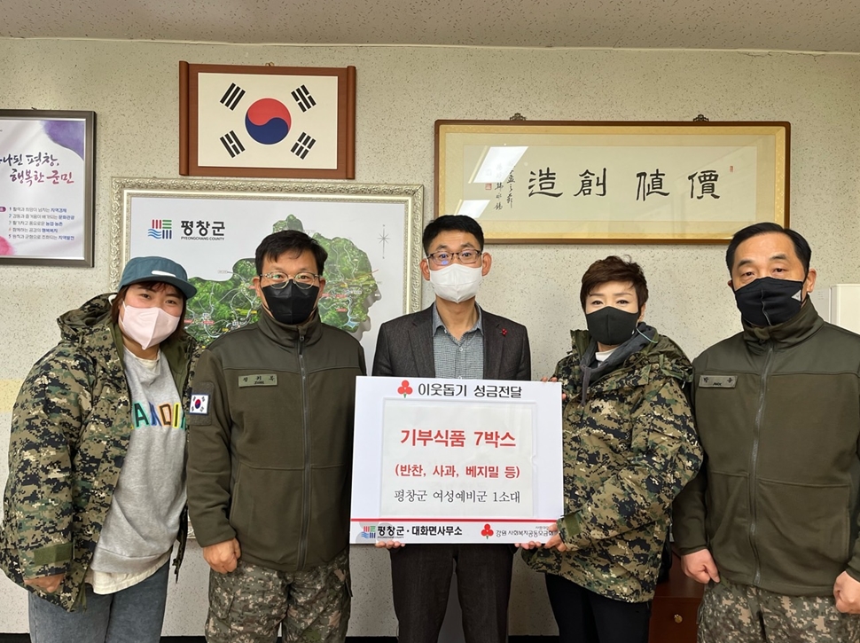 [강원사회복지신문 이정환 기자]=평창군 여성예비군 1소대(소대장 이미영)는 지난 12월 19일 평창군 대화면 내 어려운 이웃에게 전달해 달라면 반찬, 사과, 베지밀 등으로 구성된 꾸러미 7박스를 기탁하였다.