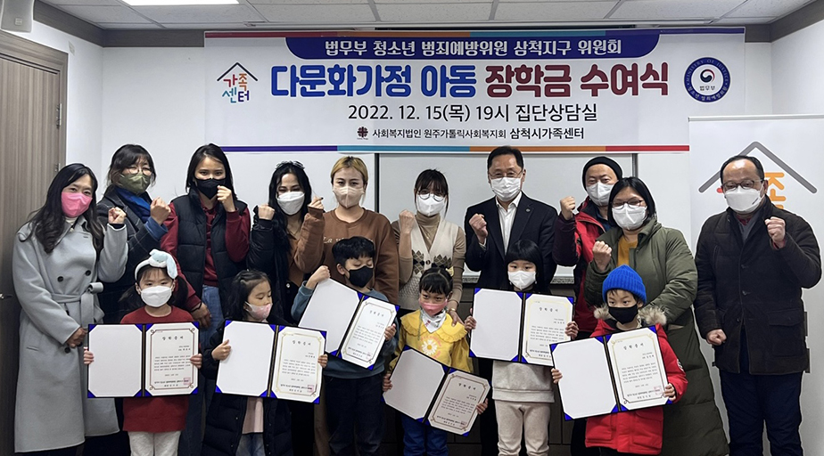 [강원사회복지신문 김종한 기자]=법무부 청소년 범죄예방위원 삼척지구 위원회는 지난 12월 15일 교육 소외극복 및 개인의 성장기회를 지원하기 위해 다문화가족 자녀 사회포용안전망 사업 대상자인 2023년 예비 초등학생을 대상으로 '다문화가정 아동 장학금 수여식'을 개최했다. 이번 수여식에서는 삼척시 가족센터에서 추...