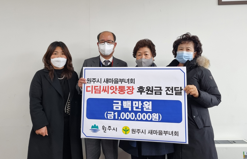[강원사회복지신문 서은진 기자]=원주시 새마을부녀회(회장 김병숙)는 지난 12월 19일 원주시청 복지국장실에서 디딤씨앗통장 적립 후원금 100만 원을 전달했다. 원주시 새마을부녀회 활동 수익금으로 마련한 이번 후원금은 아동권리보장원을 통해 경제적으로 어려운 기초생활수급자와 요보호아동 100명에게 1인당 1만 원씩 ...