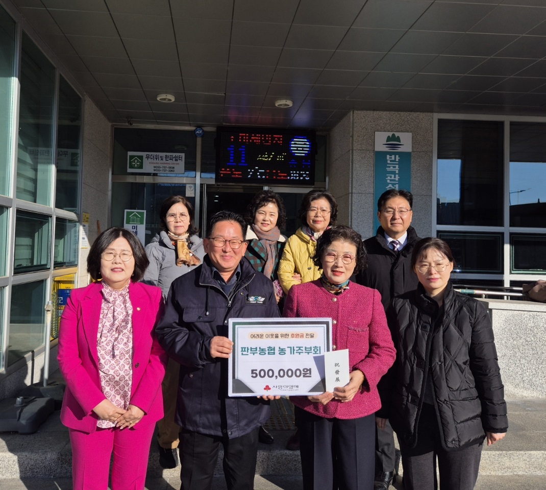 원주시 판부농협 농가주부회(조합장 배경수, 회장 최금선)는 지난 1월 7일 반곡관설동 행정복지센터를 찾아 어려운 이웃을 위한 성금 50만 원을 전달했다. 이번 후원금은 판부농협 농가주부회 회원들이 떡을 판매해 얻은 수익금으로 마련됐다. 최금선 회장은 “지역 내 도움이 필요한 분들께 의미 있게 사용되어 따뜻한 겨울...