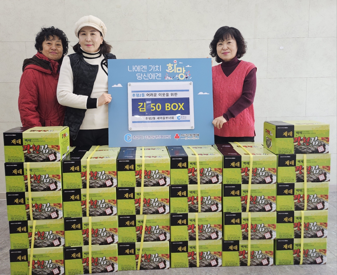 춘천시 후평2동 새마을부녀회(회장 피재남)는 1월 9일 후평2동 행정복지센터(동장 이명숙)를 방문해 설 명절을 맞아 김 50상자를 후원했다.