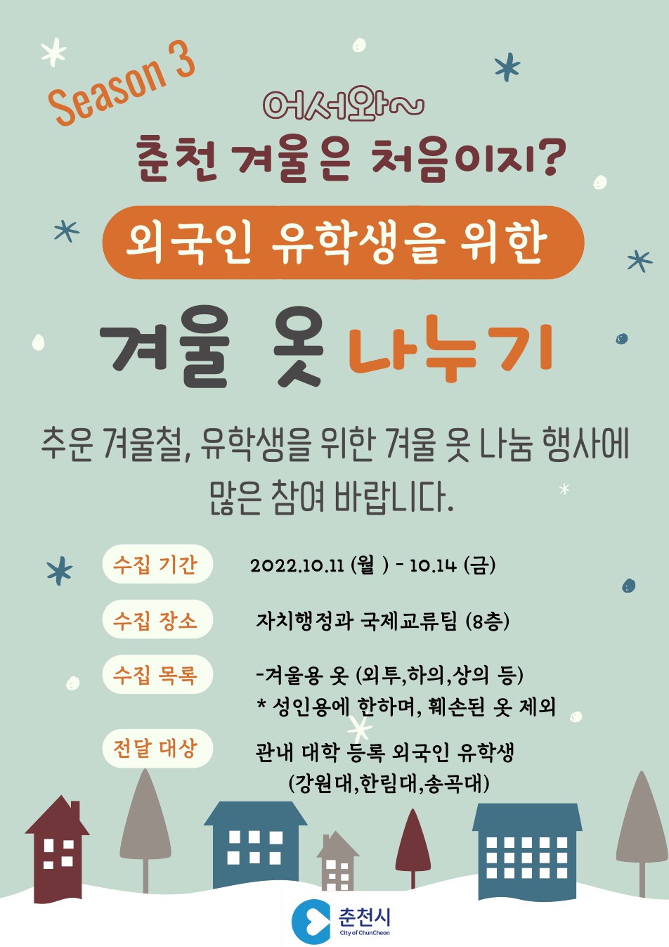 [강원사회복지신문 서은진 기자]=춘천시, 10월 11일부터 14일까지 외투, 하의, 상의 등 겨울옷 수집 지역 내 대학 외국인 유학생 나눔 예정, 지난해 268벌 전달 외국인 유학생을 위한 겨울옷 나누기가 올해도 돌아왔다. 춘천시는 오는 10월 11일부터 14일까지 외투, 하의, 상의 등 겨울용 옷을 수집한다고 밝혔다. 추운 겨울...