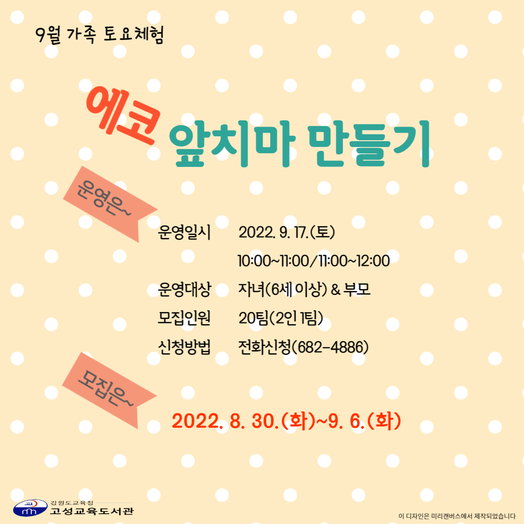 [강원사회복지신문 이정환 기자]=고성교육도서관(관장 이승봉)은 2022년 '책 놀이터, 도서관에 놀러 가자' 9월 가족 토요체험 프로그램 참가자를 지난 8월 30일부터 오는 9월 6일까지 선착순 모집한다. 9월 토요체험 프로그램은 '에코 앞치마 만들기'로 자녀(6세 이상) & 부모 20팀(40명)을 대상으로 9월 17일(토) 오전 ...
