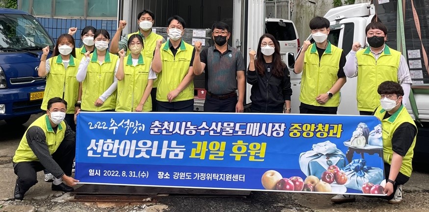 [강원사회복지신문 이정환 기자]=춘천시농수산물도매시장 소속법인 중앙청과(주)가 지난 8월 31일 강원도 가정위탁지원센터에 사과와 배 400박스(1,500만원 상당)를 전달했다.