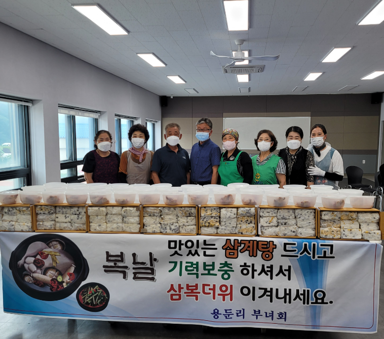 [강원사회복지신문 홍기한 기자]=횡성군 우천면 용둔리 새마을부녀회(회장:박영화)에서는 지난 7월 8일, 용둔리 마을 주민들을 위해 150인분의 삼계탕을 만들어 떡과 함께 전달하였다. 이날 전달한 삼계탕은 용둔리 새마을부녀회 폐비닐 수거 판매 수익금 등 부녀회 기금으로 마련한 것이다. 박영화 용둔리 부녀회장은 "더운...