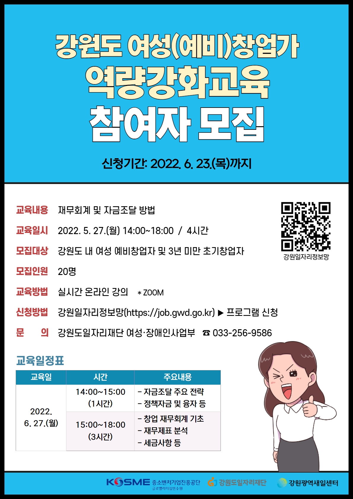 [강원사회복지신문 서은진 기자]=예비·초기 창업가 재무회계 및 자금조달 방법 강의 중소벤처기업진흥공단 글로벌리더십연수원(연수원장 송진수, 이하 중진공)과 강원도일자리재단(대표이사 박광용, 이하 재단)은 도내 여성 예비창업가 및 초기 창업가 등을 대상으로 오는 6월 27일 '여성창업가 역량강화 교육'을 온라인으로...