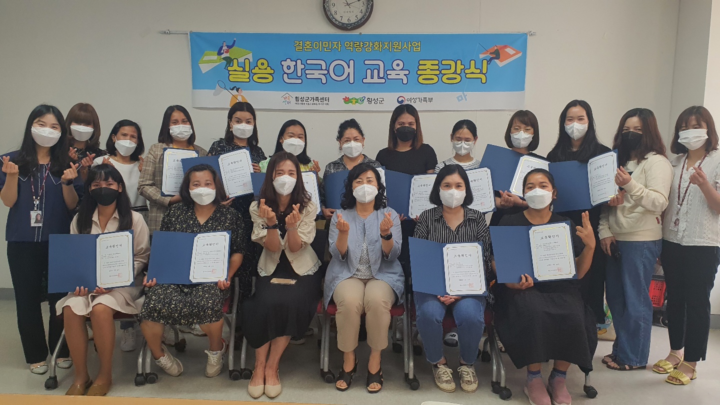 [강원사회복지신문 홍기한 기자]=횡성군가족센터(센터장 전명희)는 지난 6월 20일 결혼이민자 역량강화지원사업의 일환으로 진행된 상반기 실용한국어교육 종강식을 가졌다. 센터는 관내 결혼이민자와 중도입국자녀 등 다문화가정을 대상으로 올해 2월부터 6월까지 여성가족부 실용한국어교육을 진행하였다. 뿐만 아니라 법무...