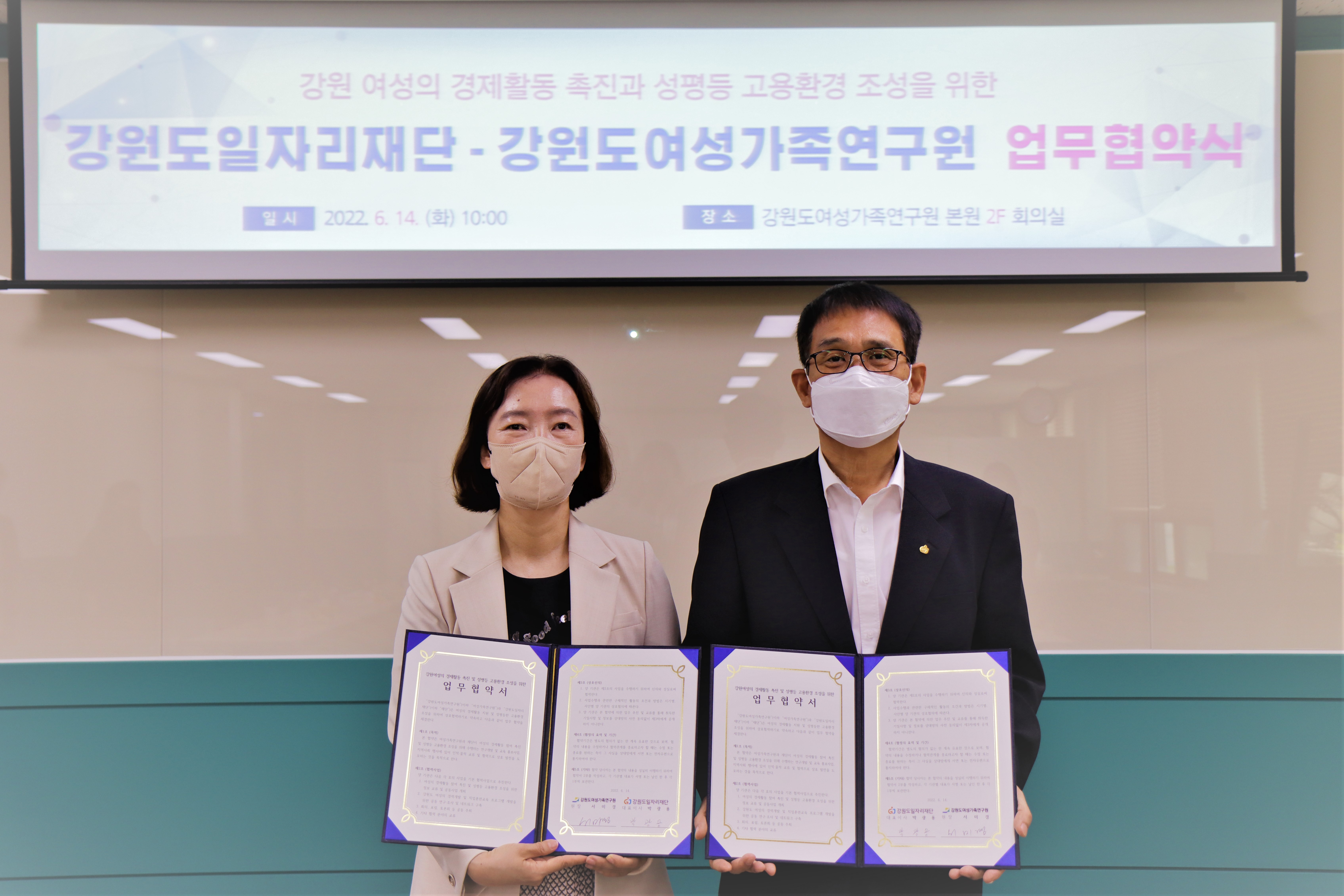 [강원사회복지신문 홍기한 기자]=강원여성의 경제활동 촉진과 성평등 고용환경 조성을 위한 업무협약 체결 강원도일자리재단(대표이사 박광용, 이하 '재단')은 도내 여성의 성공적인 사회진출과 경력 유지를 위해 강원도여성가족연구원(원장 서미경, 이하 '연구원')과 지난 6월 14일 업무 협약을 체결하였다. 양 기관은 이번...