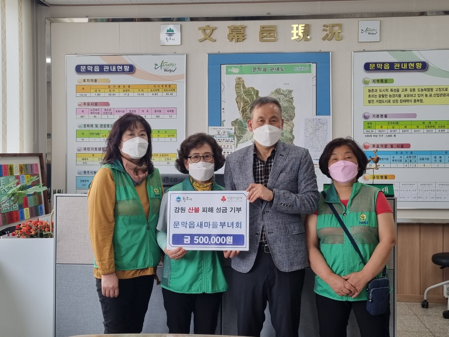 [강원사회복지신문 이정환 기자]=원주시 문막읍 새마을부녀회(회장 김옥화)는 지난 4월 25일 원주시 문막읍 행정복지센터를 방문해 강원 동해안 산불로 어려움을 겪고 있는 이재민을 돕기 위해 성금 50만 원을 전달했다. 김옥화 새마을부녀회장은 "작은 정성이지만, 어려움을 겪고 있는 이재민들이 희망을 잃지 않고 하루빨리...