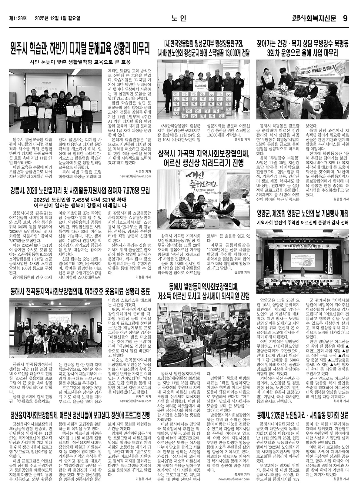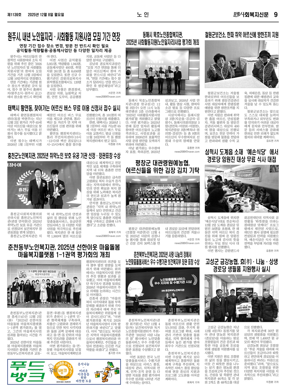춘천동부노인복지관(관장 종세스님)은 지난 6월 12일(수)과 6월 18일(화), ‘내 인생 아름다운 순간 '눈이 부신 날' 장수사진 촬영을 진행했다. 이번 촬영은 춘천한샘고등학교 뷰티패션과, 한울스튜디오가 함께 참여하여 지역사회와 세대 간의 따뜻한 연대를 실현하는 뜻깊은 자리였다. 본 행사는 저소득층 어르신 10명을 대...