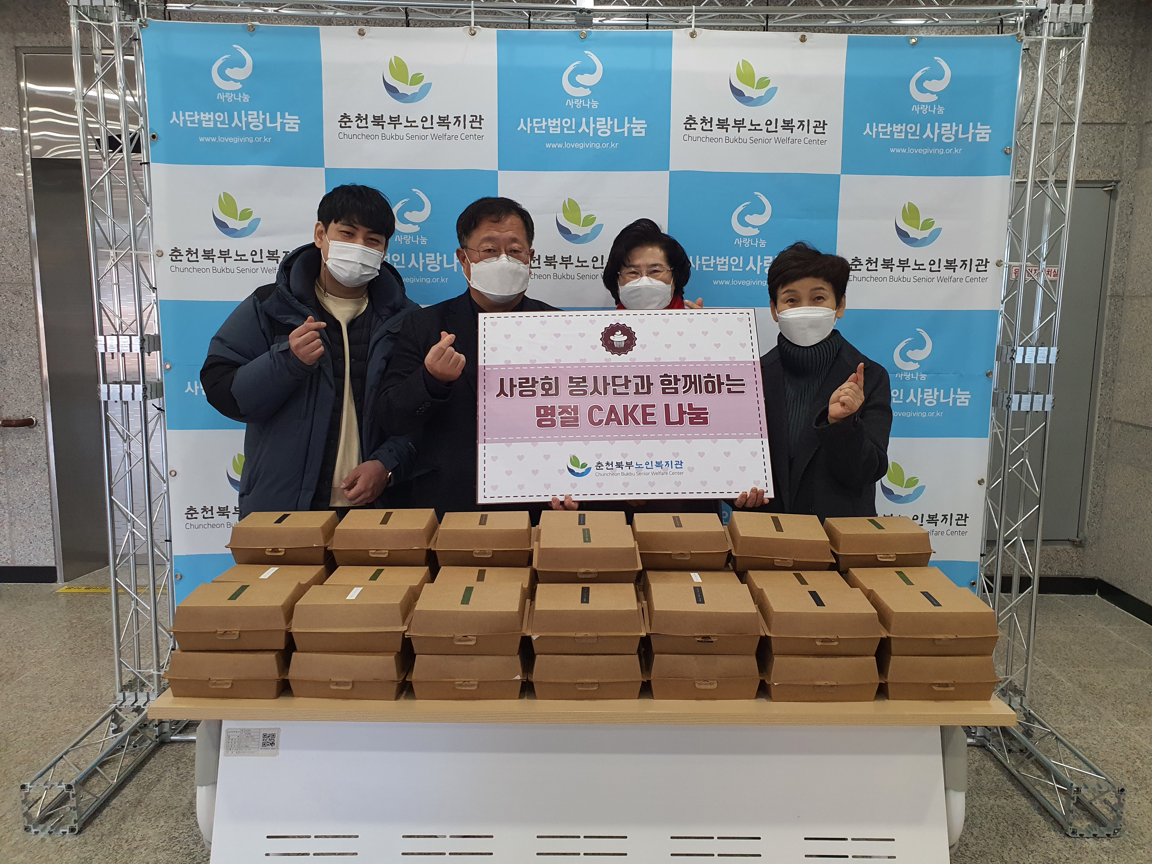 [강원사회복지신문 이정환 기자]=사랑회 봉사단은 지난 1월 28일 춘천북부나눔재가노인센터(센터장 박재호)를 찾아 설 명절을 홀로 보내시는 어르신들에게 조금이나마 위로를 드리고 싶다며 '명절 ckae 나눔' 전달식을 가졌다. 이날 후원된 케이크는 지역사회 내 저소득 홀몸 어르신 40가구에 전달될 예정이다. 사랑회 봉사단...