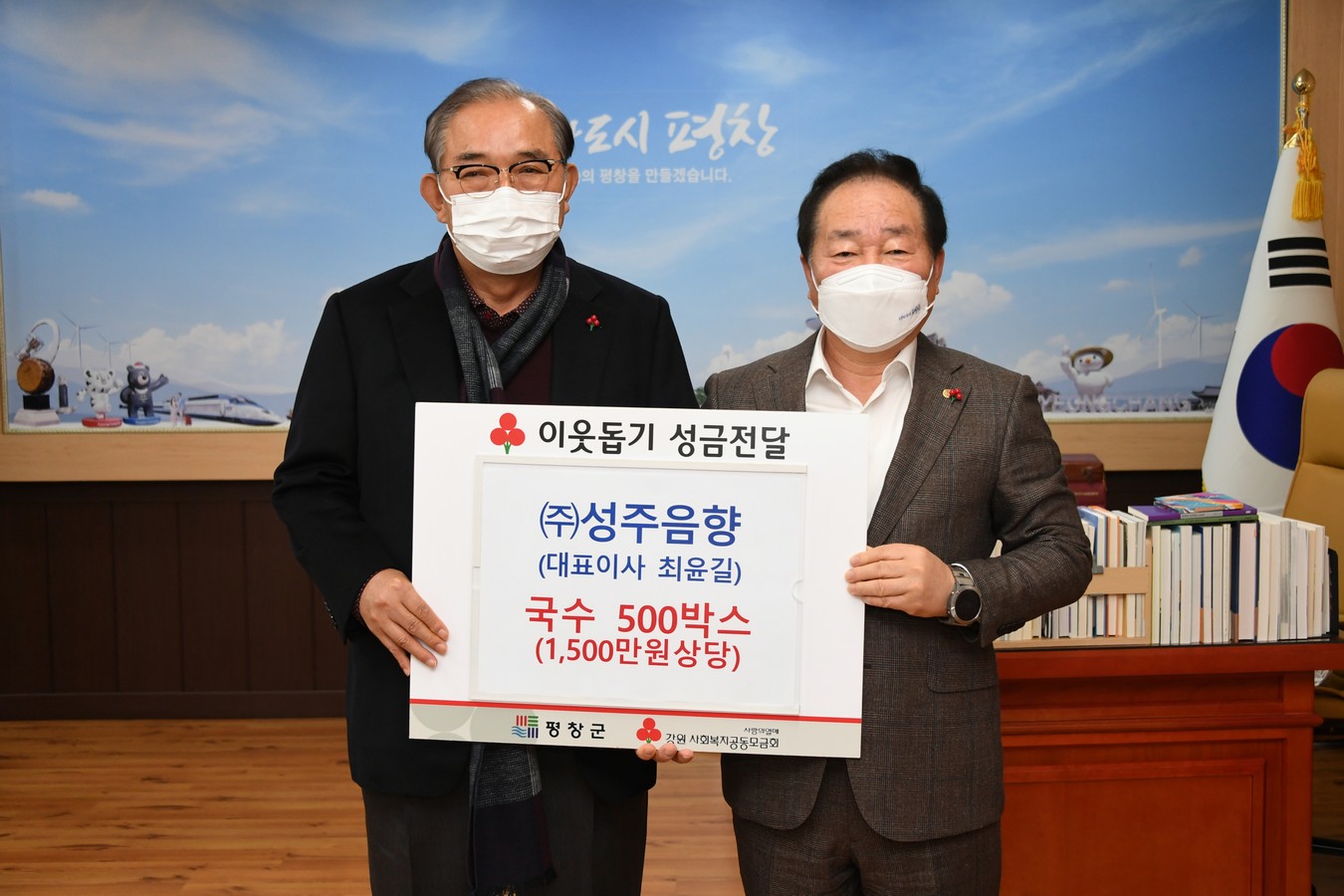 [강원사회복지신문 이정환 기자]=(주)성주음향(대표이사 최윤길)은 지난 12월 8일 평창군을 방문하여 관내 경로당에 전달해 달라며 국수 500박스(1,500만원 상당)을 기탁했다. (주)성주음향 최윤길 대표이사는 평창군 출신 기업인으로 2016년 국수 450박스 기부를 시작으로 최근 5년간 고향 어르신들을 위해 국수 2,450박스(...