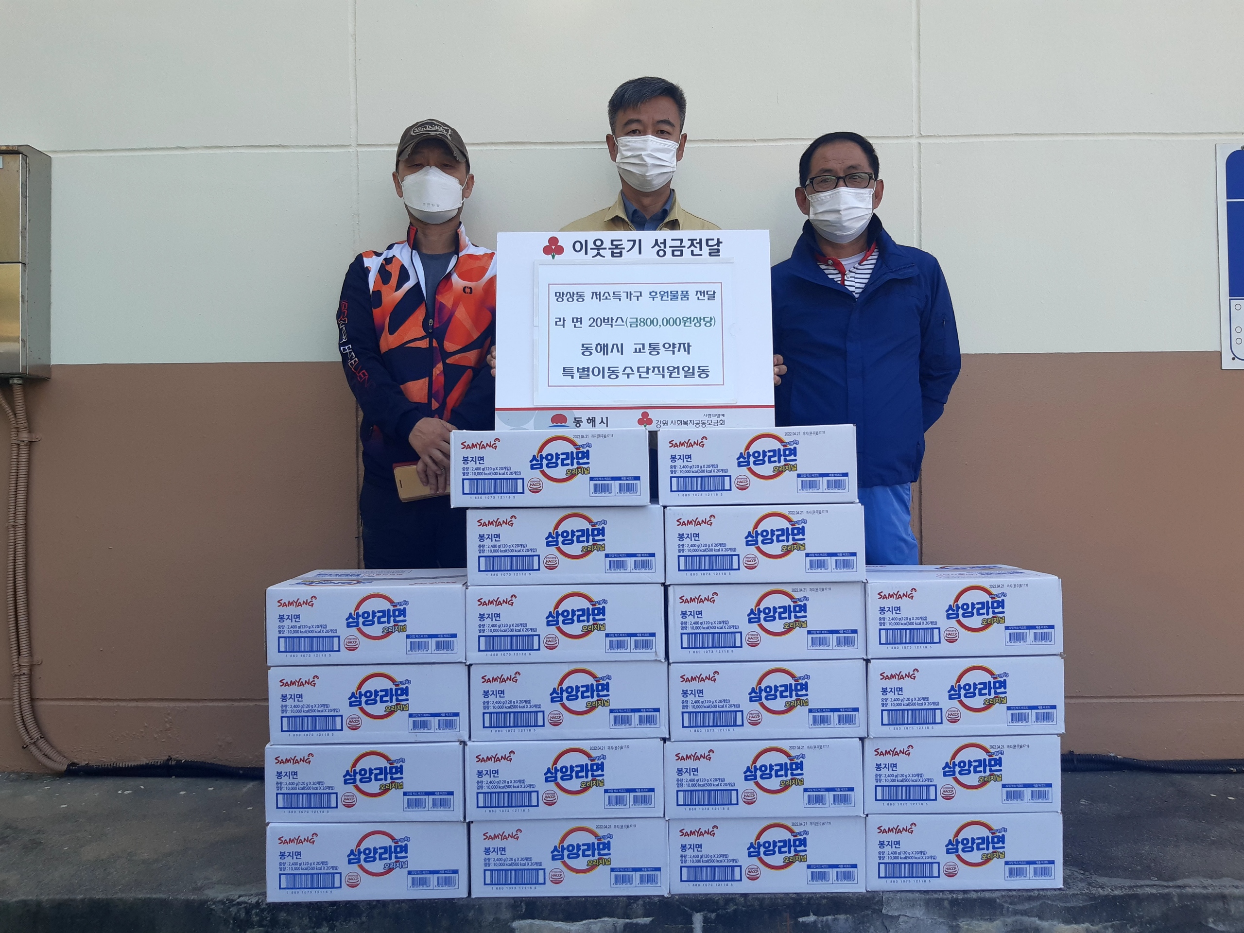 [강원사회복지신문 이정환 기자]=80만원 상당 라면 20박스 기탁 동해시교통약자특별이동수단 직원일동은 동절기를 맞이해 망상동 관내 취약계층(저소득층, 독거노인)에게 전달해 달라며 80만원 상당의 라면 20박스를 기탁했다.