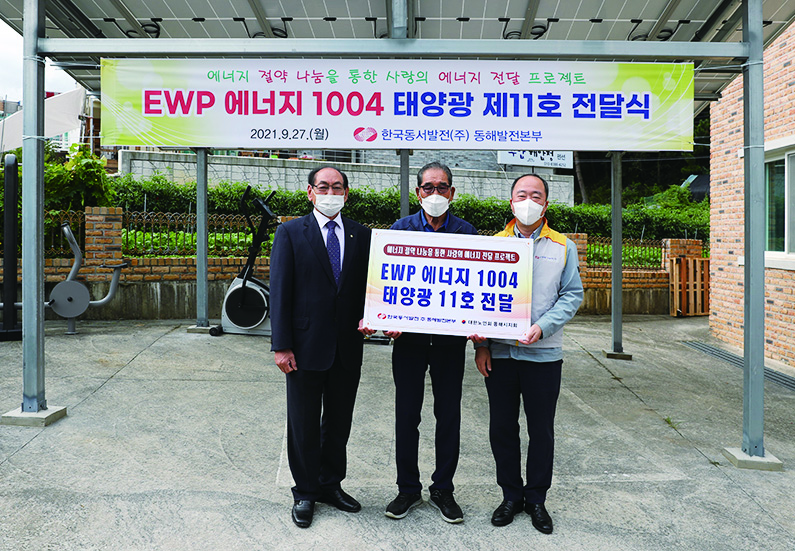 [강원사회복지신문 김종한 기자]=한국동서발전(주) 동해발전본부(본부장 남석열)는 지난 9월 27일 동해시 추암경로당에서 'EWP에너지 1004 태양광 제11호' 전달식을 가졌다. EWP에너지1004는 사회공헌 플랫폼 앱 '워크온'을 통해 일반시민과 임직원의 걸음 수가 목표에 달성하면 이웃에 태양광 설비를 전달하는 방식으로 에너...