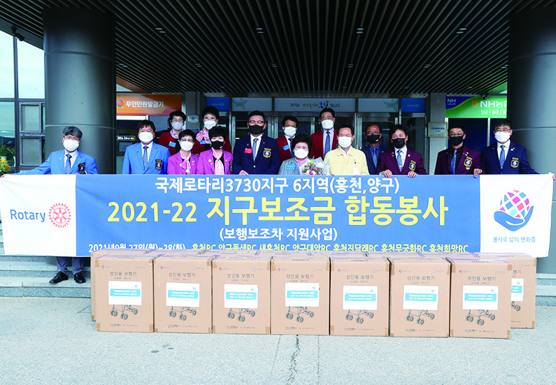 [강원사회복지신문 유경수 기자]=국제로타리클럽 3730지구 6지역(대표 강환영)은 지난 9월 27일 홍천군청을 방문, 취약계층 어르신에게 전달할 800만원 상당의 보행 보조기 실버카 60대를 전달했다. 후원물품은 홍천 관내 5개 로타리클럽에서 합동 보조금 사업의 일환으로 마련했다. 실버카는 수술 및 관절염으로 거동이 불편...