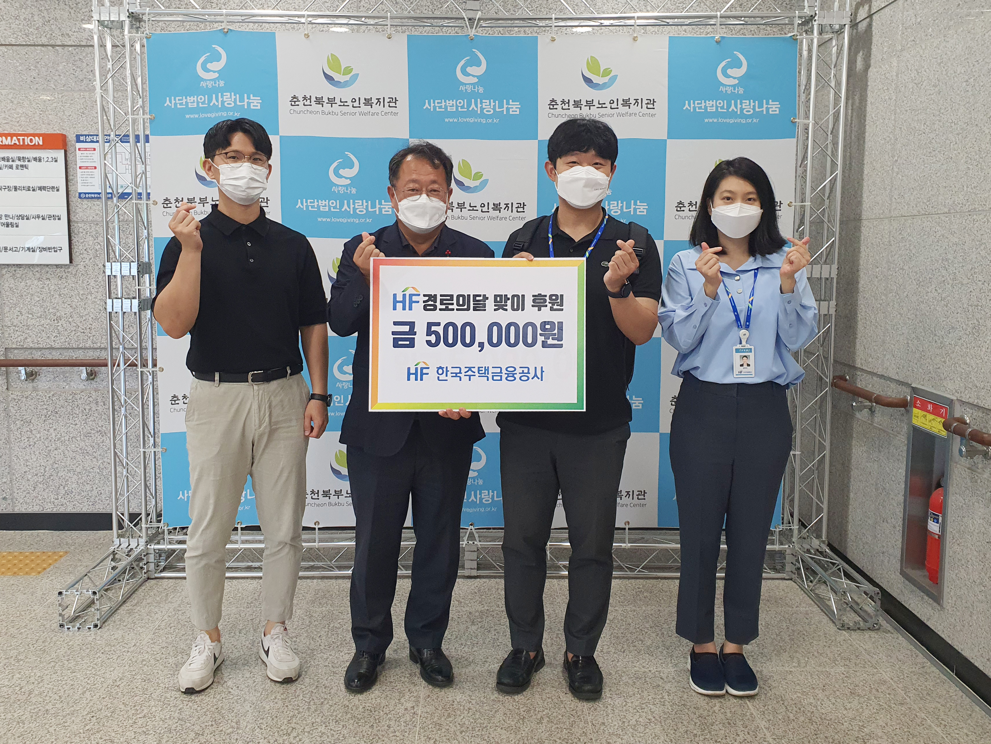 [강원사회복지신문 서은진 기자]=춘천북부노인복지관은 한국주택금융공사로부터 50만원의 후원금을 전달받았다. 경로의달을 맞이하여 어르신들과 행복한 동행을 통해 어르신들께 힘이 되어드리기 위해 후원금을 전달하며 추석의 훈훈함을 이어갔다. 춘천북부노인복지관 관장 박재호는 "어르신들을 위해 후원해주셔서 감사하다...