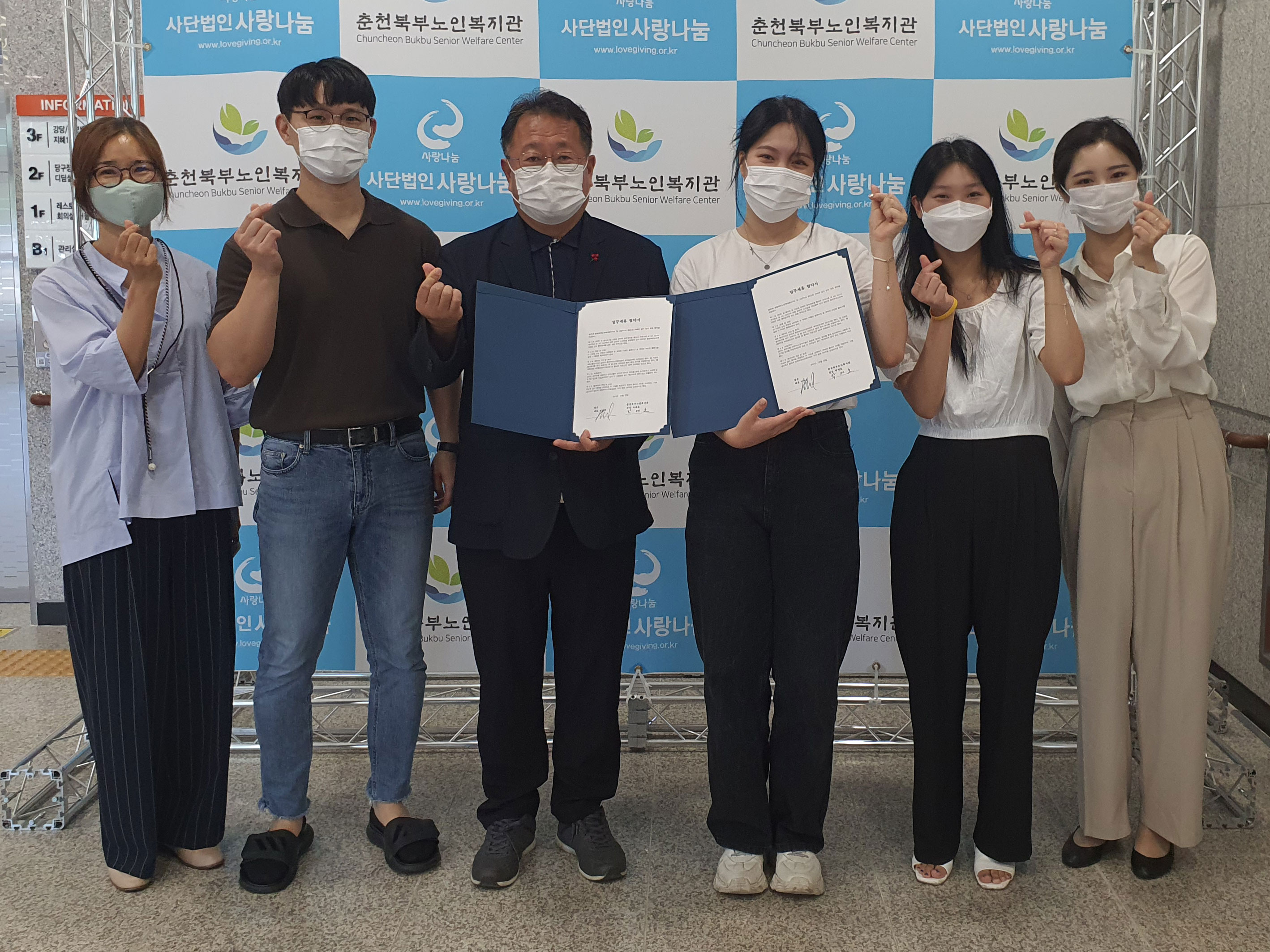 [강원사회복지신문 홍기한 기자]=춘천북부노인복지관(관장 박재호)과 한림대학교 창업동아리 담은(대표 이명은)은 지난 7월 22일(목)에 춘천북부노인복지관에서 지역 내 독거노인을 지원하기 위한 사회공헌 업무협약을 체결했다. 이날 진행한 업무협약의 내용은 지역사회 내 독거노인과 대학생 서포터즈의 1:1 매칭 프로그램...