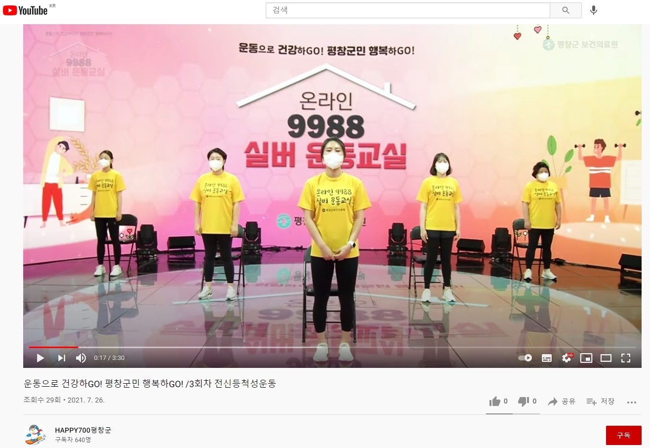 [강원사회복지신문 이정환 기자]=평창군보건의료원과 함께 '온라인 9988 실버 운동교실' 참여해요 평창군 보건의료원은 지역 어르신들의 건강한 일상 유지와 면역력 증진에 도움을 주고자 운동영상을 제작하여 어르신들께 비대면으로 보급한다고 밝혔다. 코로나19의 지속적인 확산세로 야외활동이 제한되어 집에 있는 시간이...