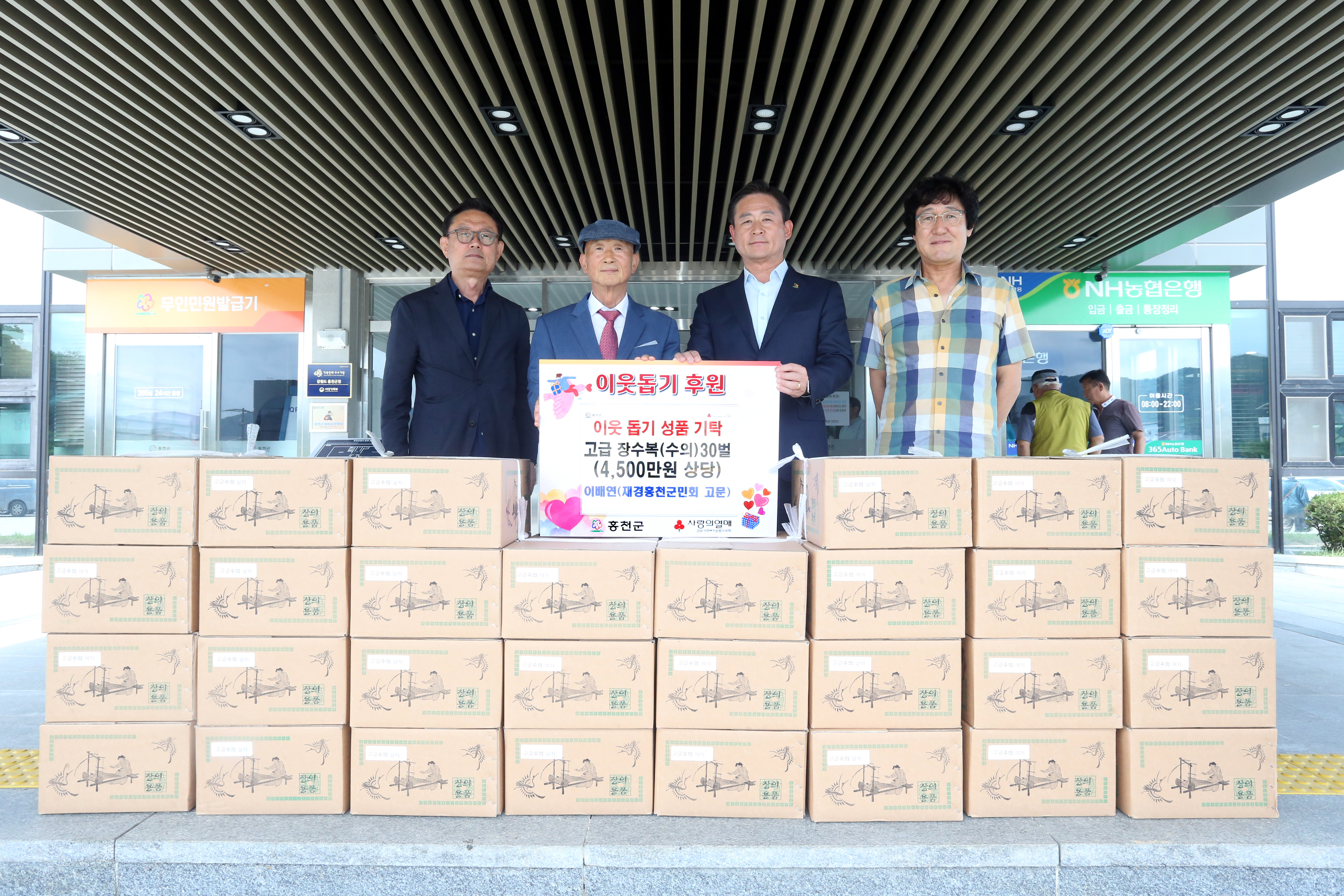 재경홍천군민회 이배연 고문은 지난 7월 11일 홍천군청을 방문하여 관내 생활이 어려운 어르신들을 위해 4,500만 원 상당의 장수복(수의) 30벌을 전달했다. 이배연 고문은 ㈜강원기업사를 운영하고 있으며, 작년 8월에도 생활이 어려운 어르신들을 위해 장수복(수의)을 기탁했다. 이배연 고문은 “내고장 홍천의 어르신들의 ...