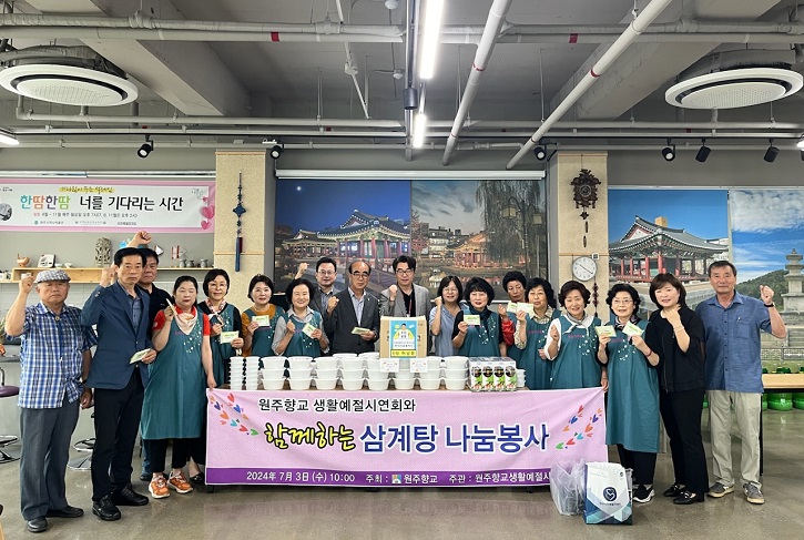 원주향교 생활예절시연회(회장 박은순)는 지난 7월 3일 관내 취약계층 30가구 대상으로 삼계탕 나눔 행사를 실시했다. 이번 나눔 행사는 취약계층 어르신들의 안부확인과 체력보강을 위해 마련됐으며, 회원들과 명륜1동 행정복지센터 직원들이 함께 취약계층 30가구에 직접 방문·전달했다. 박은순 회장은 “주변 이웃을 위해...