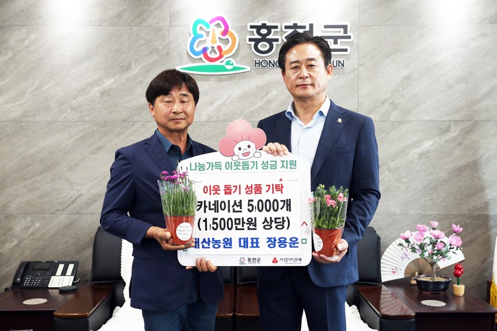 태산농원(대표 장용운)은 지난 5월 1일 홍천군청을 방문하여 카네이션 5,000송이(1,500만원 상당)를 기탁했다. 장용운 대표는 지난 4년 동안 어버이날을 맞아 10개 읍·면의 새마을 부녀회를 통해 지역 어르신들께 카네이션을 후원하고 있다. 이날 전달된 성품은 10개 읍·면 새마을 부녀회를 통해 관내 지역 어르신들에게 배...