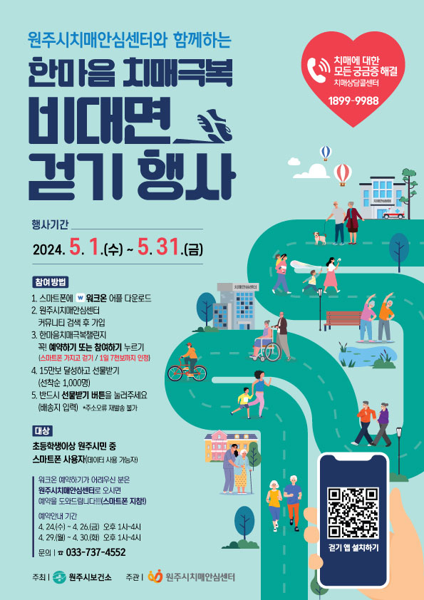 5월 1일~5월 31일 15만 보 걷기, 선착순 1,000명 완주기념품 제공 원주시치매안심센터는 5월 한 달간, ‘한마음 치매극복 비대면 걷기 행사’를 개최한다. 치매예방에 좋은 ‘걷기’를 실천하여 치매 극복을 기원하고 치매에 대한 부정적인 인식을 개선하여 치매친화형 도시 조성을 위해 마련됐다. 이번 행사는 모바일 걷기 ...