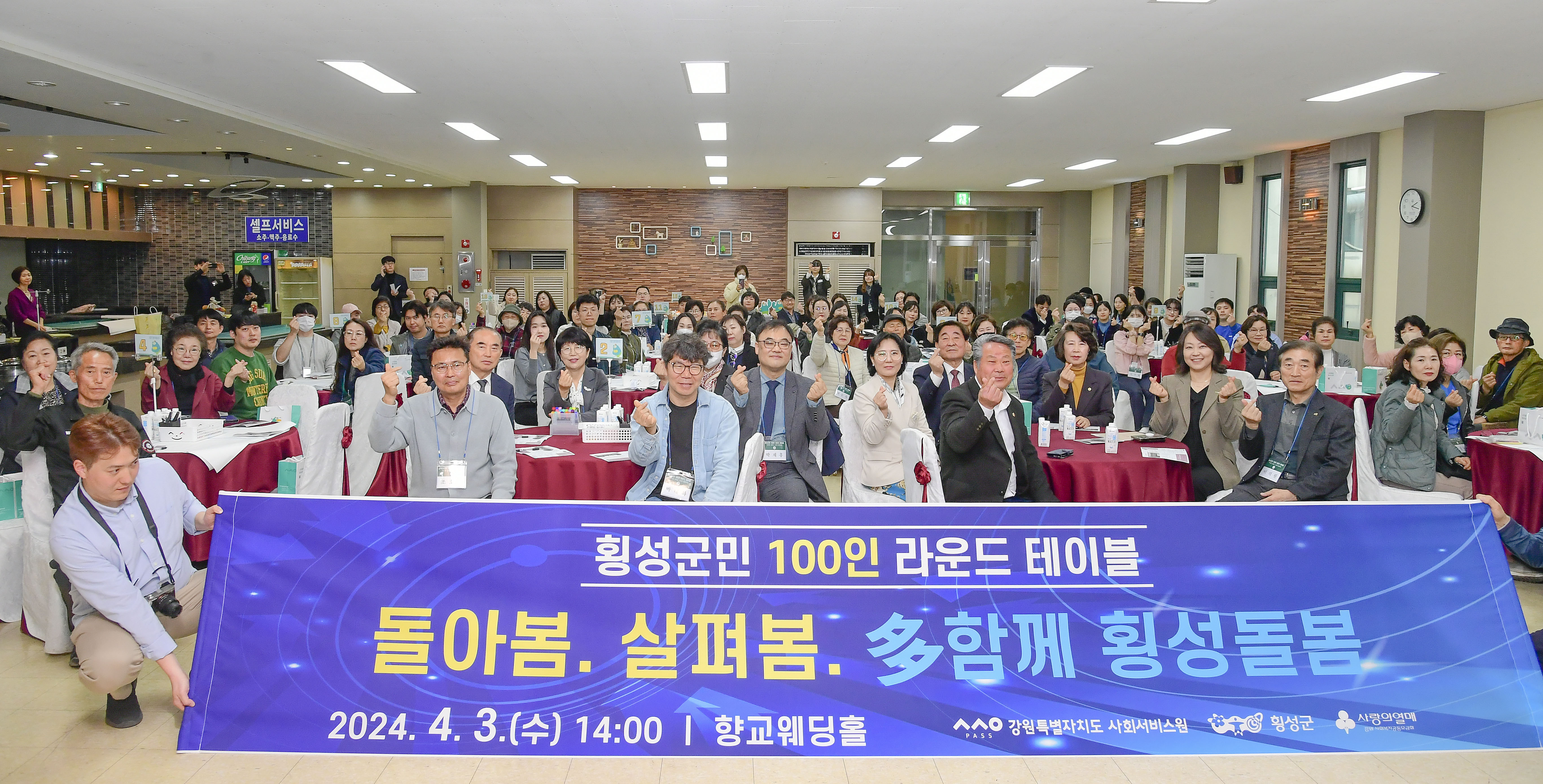 횡성군민 100인, ‘돌아봄 살펴봄 多함께 횡성 돌봄’ 주제로 토론 횡성형 노인 통합돌봄 사업, 주민들의 의견 반영되어야… 횡성군(군수 김명기)은 강원특별자치도사회서비스원(원장 이은영)과 지역 중심 돌봄 의제 발굴을 위해 횡성군민 100인 라운드테이블 ‘돌아봄. 살펴봄. 多함께 횡성 돌봄’을 지난 4월 3일 향교웨딩...