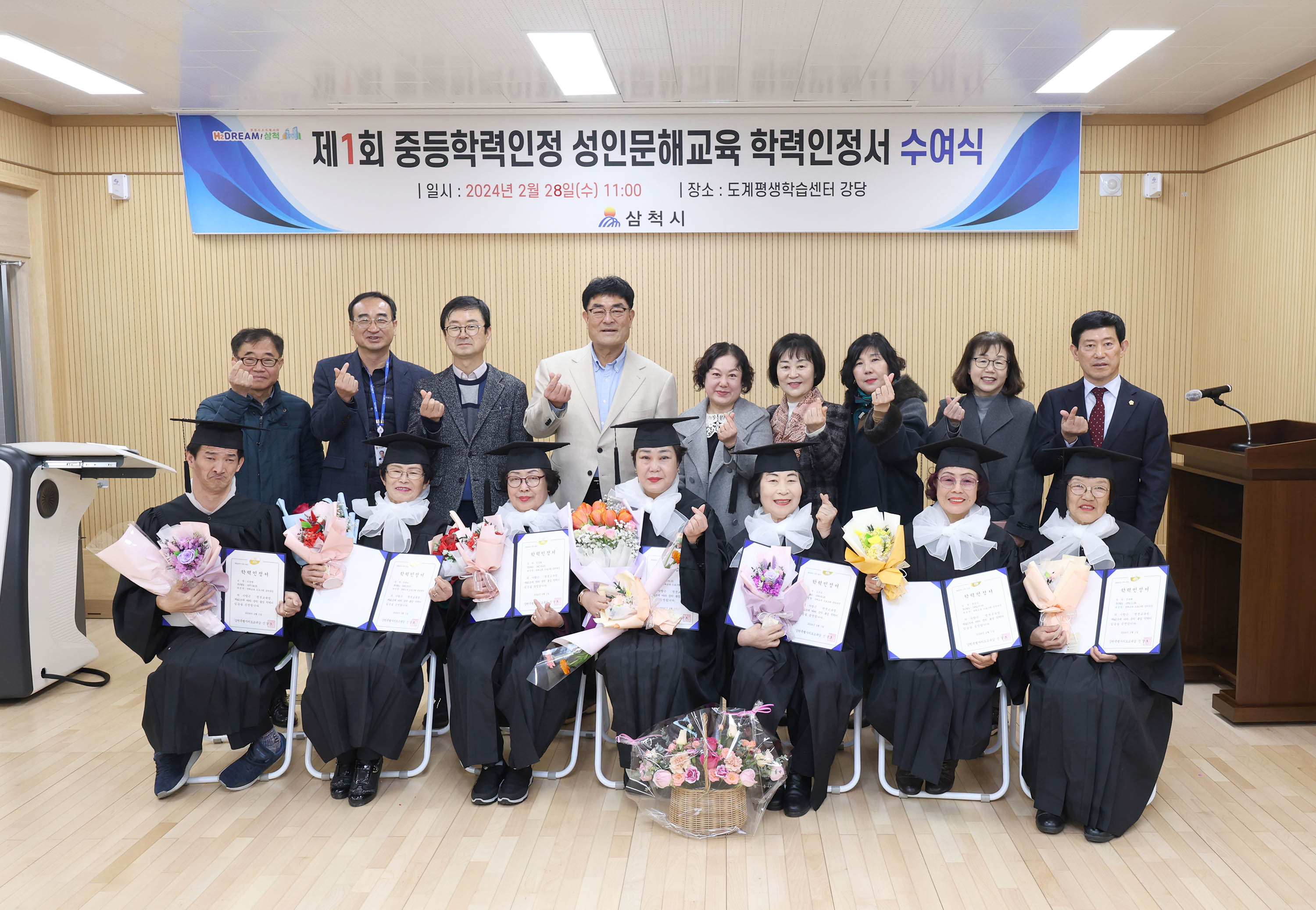 삼척시가 강원특별자치도교육청으로부터 ‘2021년 중학 학력인정 성인문해 교육 프로그램 운영기관’으로 지정받고 처음으로 8명의 중학학력 인정자를 배출하였다. 삼척시는 지난 2월 28일 수요일 도계평생학습센터 강당에서 박상수 시장과 양희전 삼척시의회 부의장을 비롯한 내빈과 교사, 가족 등 50여명이 참석한 가운데 ...