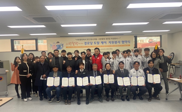 원주시와 (사)대한노인회원주시지회(대표 유종우)는 지난 3월 5일 오전 10시 30분에 대한노인회원주시지회 강당에서 6개 기관·단체와 '사방팔방 경로당 토탈케어 자원봉사' 협약을 체결했다. 이번 협약에는 원주시와 (사)대한노인회원주시지회를 비롯해 원주청년소상공인협회와 상지대학교 부속한방병원, 팀 랩터스, 봉주르...