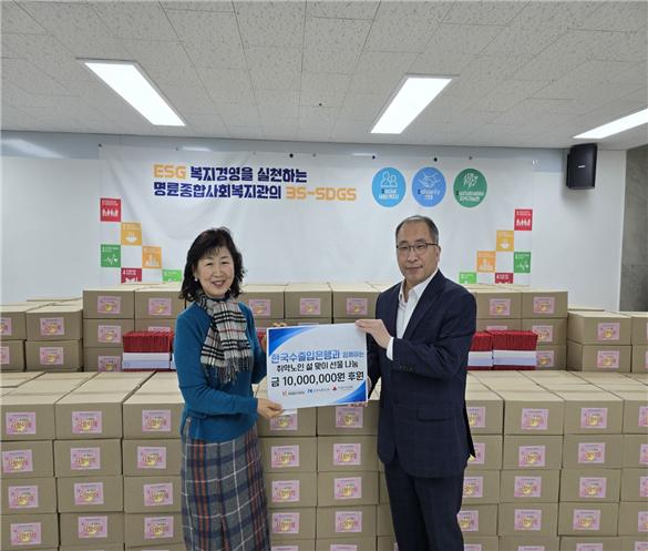 한국수출입은행(김원석 본부장)에서는 지난 2월 6일 설날을 맞이하여 원주 명륜종합사회복지관(박현숙 관장)에 10,000,000원의 후원금을 전달하였다. 이번 후원금으로 설날을 느낄 수 있는 식료품(떡, 사골곰탕, 도시락 김)과 손수건으로 구성된 선물 꾸러미를 제작하여 돌봄을 필요로 하는 고령 및 독거노인 830세대에 전달...