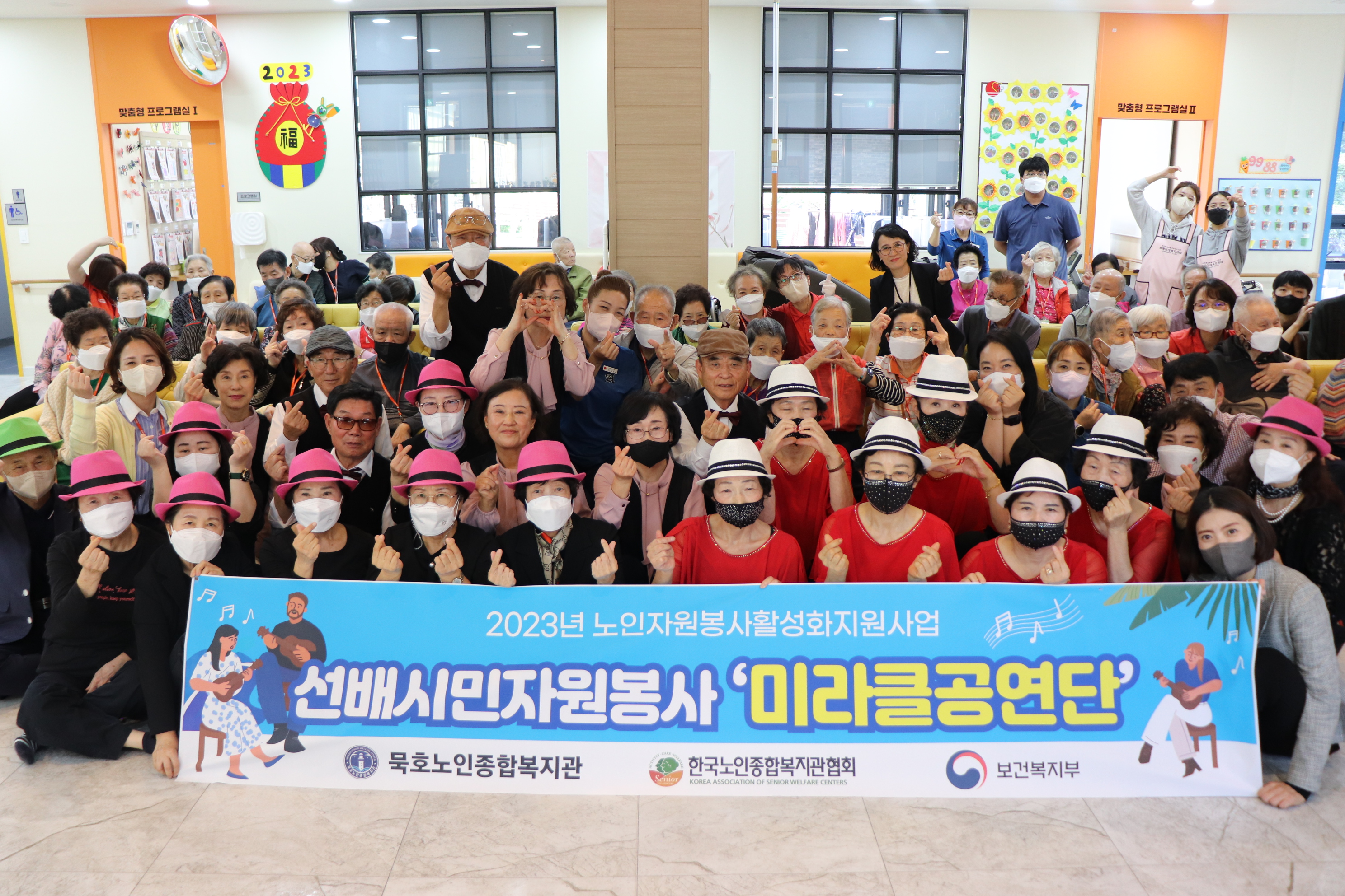동해 묵호노인종합복지관(관장 염규성)은 한국노인종합복지관협회 공모사업으로 운영 되고 있는 선배시민자원봉사 '미라클 공연단'이 지난 10월 20일(금) 14시 동해시 발한동에 소재하고 있는 동해이레복지센터 방문하여어르신들을 위해 공연을 실시하였다. 2023년 노인자원봉사활성화 지원사업인 선배시민자원봉사단은 우쿨...