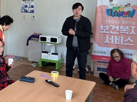 원주시 반곡관설동(동장 김효중)은 지난 11월 8일 청솔6차아파트 경로당을 방문하여 '경로당으로 찾아가는 보건복지서비스'를 추진했다. 이날 반곡관설동 찾아가는 보건복지팀은 경로당을 찾아가 어르신들의 혈압체크 및 건강상담, 만성질환(고혈압, 당뇨, 치매 등)관련 교육과 더불어 맞춤형 복지상담을 함께 진행한다. '경...