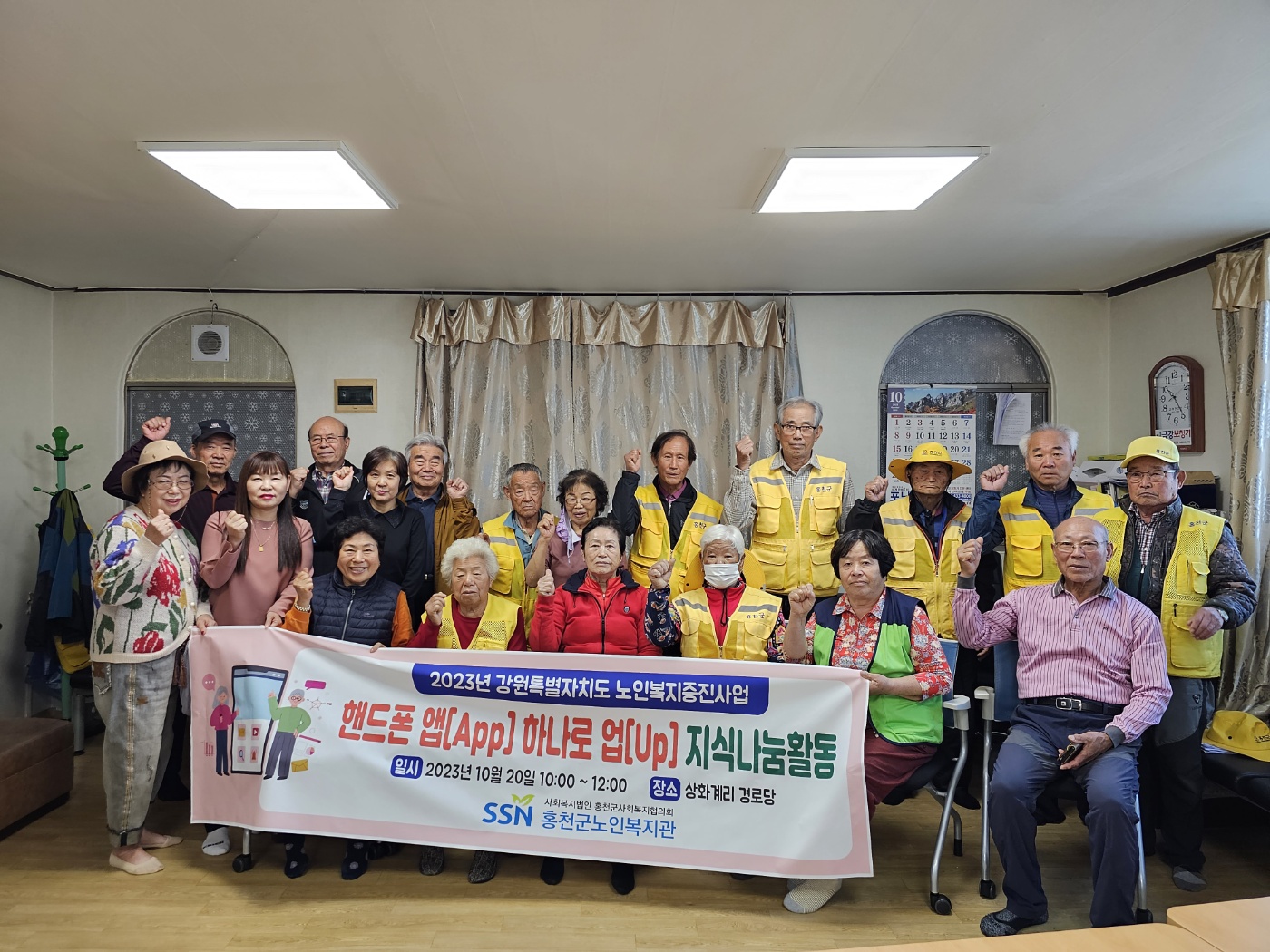 홍천군 북방면 고령자 복지주택 내 노인복지관에서는 지난 10월 20일 금요일 10시부터 12시까지 강원도 노인복지증진 공모사업 '핸드폰앱(App) 하나로업(Up)' 프로그램의 공익 활동 일환으로 경로당 지식 나눔 활동을 진행하였다. 지식 나눔 활동은 '핸드폰앱(App) 하나로업(Up)' 프로그램 참여 어르신들이 경로당 어르신들에...