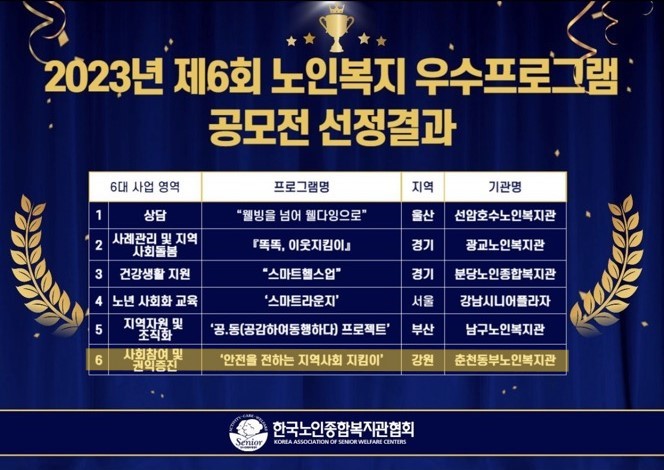 [강원사회복지신문 서은진 기자]=춘천동부노인복지관(관장 종세스님)은 한국노인종합복지관 협회에서 주관하는 2023년 제6회 전국노인복지관 대회 우수프로그램 공모전에서 '강원사회복지공동모금회 지원사업 2023년 시니어 생활안전 전문 강사양성사업(CPR) 안전지킴이'가 선정됐다고 지난 9월 20일 밝혔다. '2023년 시니어...