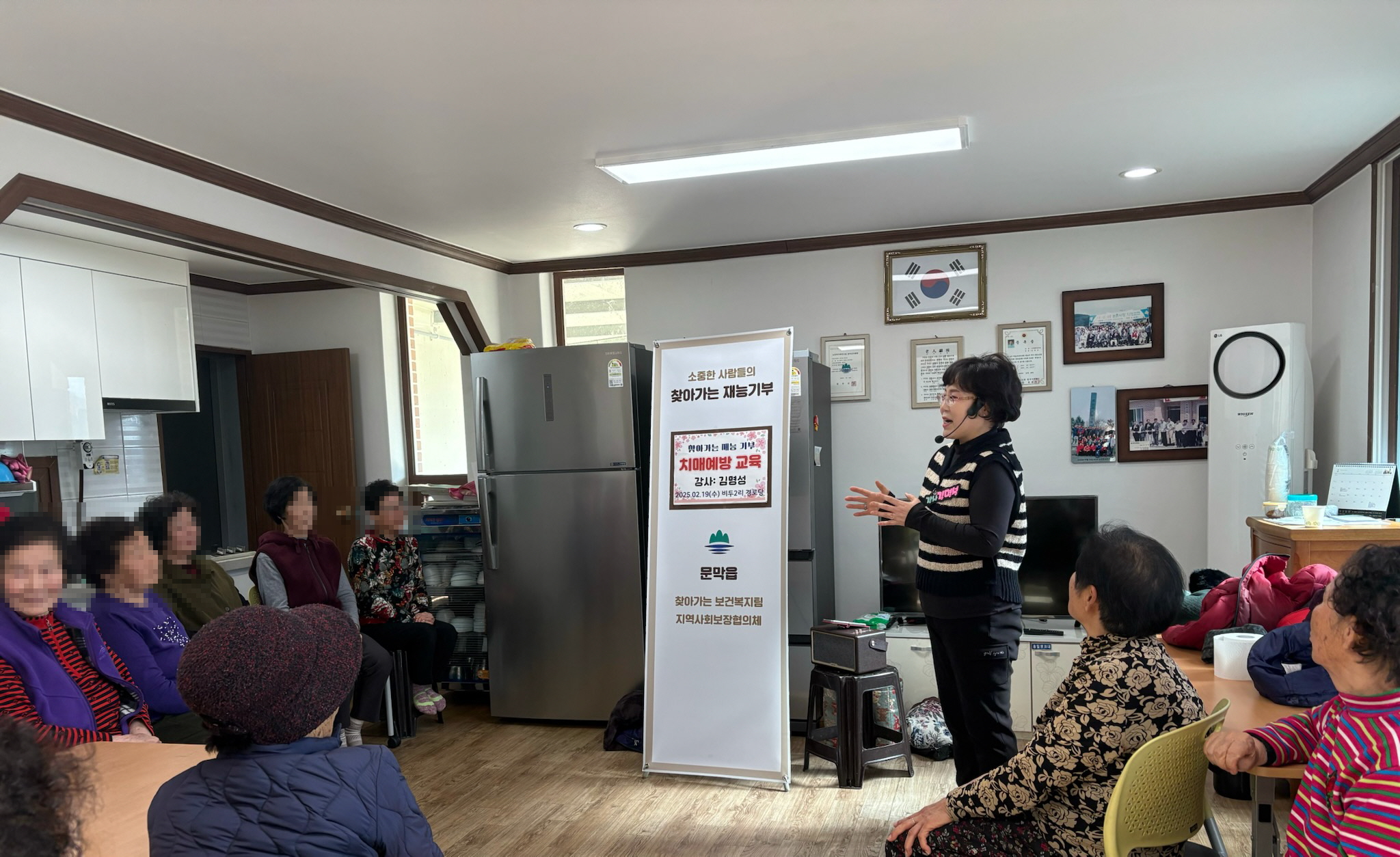문막읍지역사회보장협의체와 연계한 치매예방교육 진행 원주시 문막읍지역사회보장협의체(공공위원장 이인환, 민간위원장 김기붕)는 특화사업인 ‘찾아가는 재능기부 봉사’의 일환으로, 지난 2월 19일(수) 웃음치료사 김명성 강사와 비두2리 경로당을 찾아 치매예방교육을 진행했다.