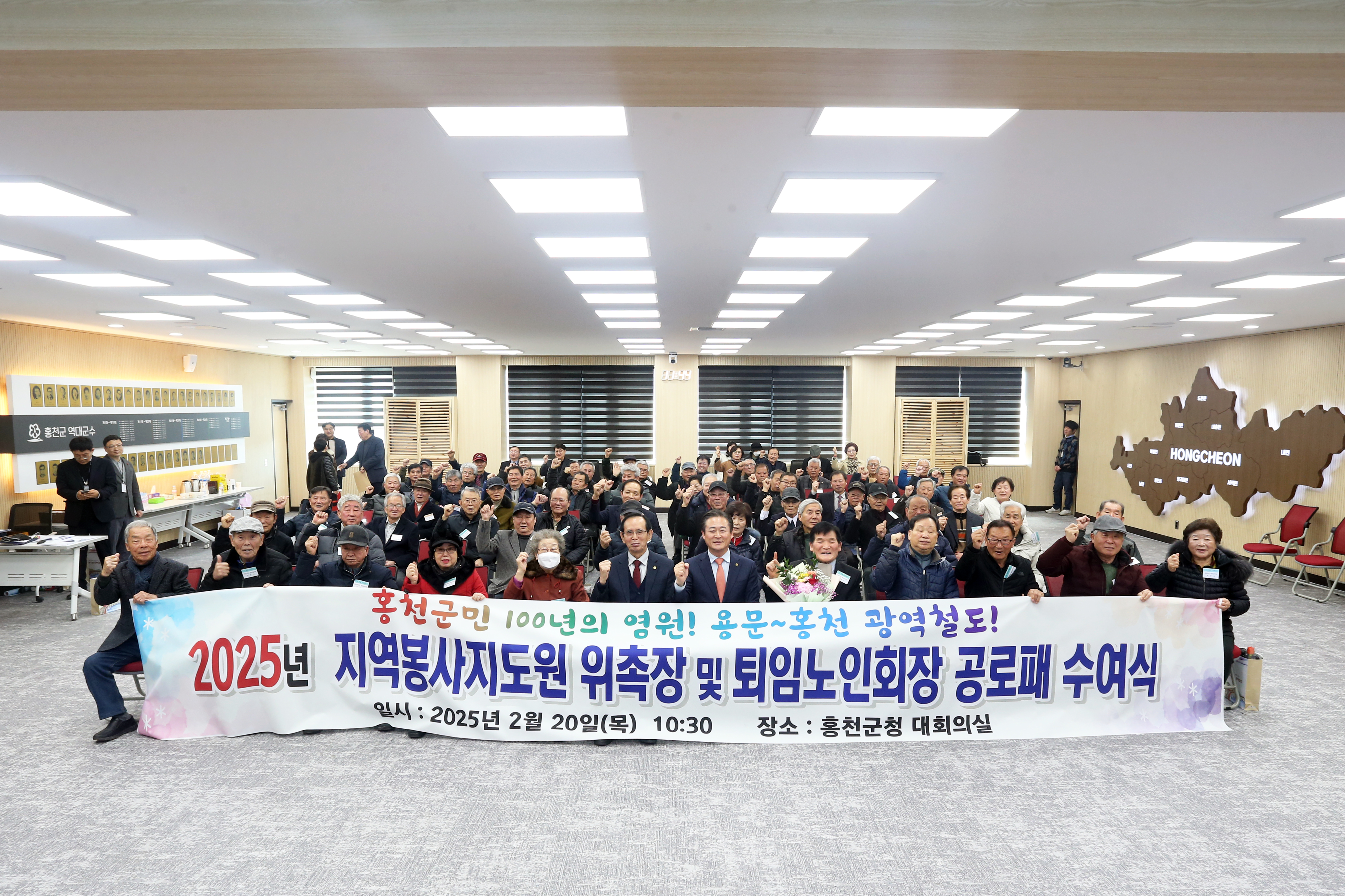 신규 지역봉사지도원 41명, 퇴임 노인회장 41명 홍천군이 2025년 2월 20일 오전 10시 30분 홍천군청 대회의실에서 신규 노인 지역 봉사지도원 위촉장 및 퇴임 노인회장 공로패 수여식을 개최했다. 이형주 홍천군노인회 지회장 외 사영한 부회장, 정영심 부회장과 홍천읍 현종길 분회장 외 면 노인회 분회장, 읍면장 등 100여...