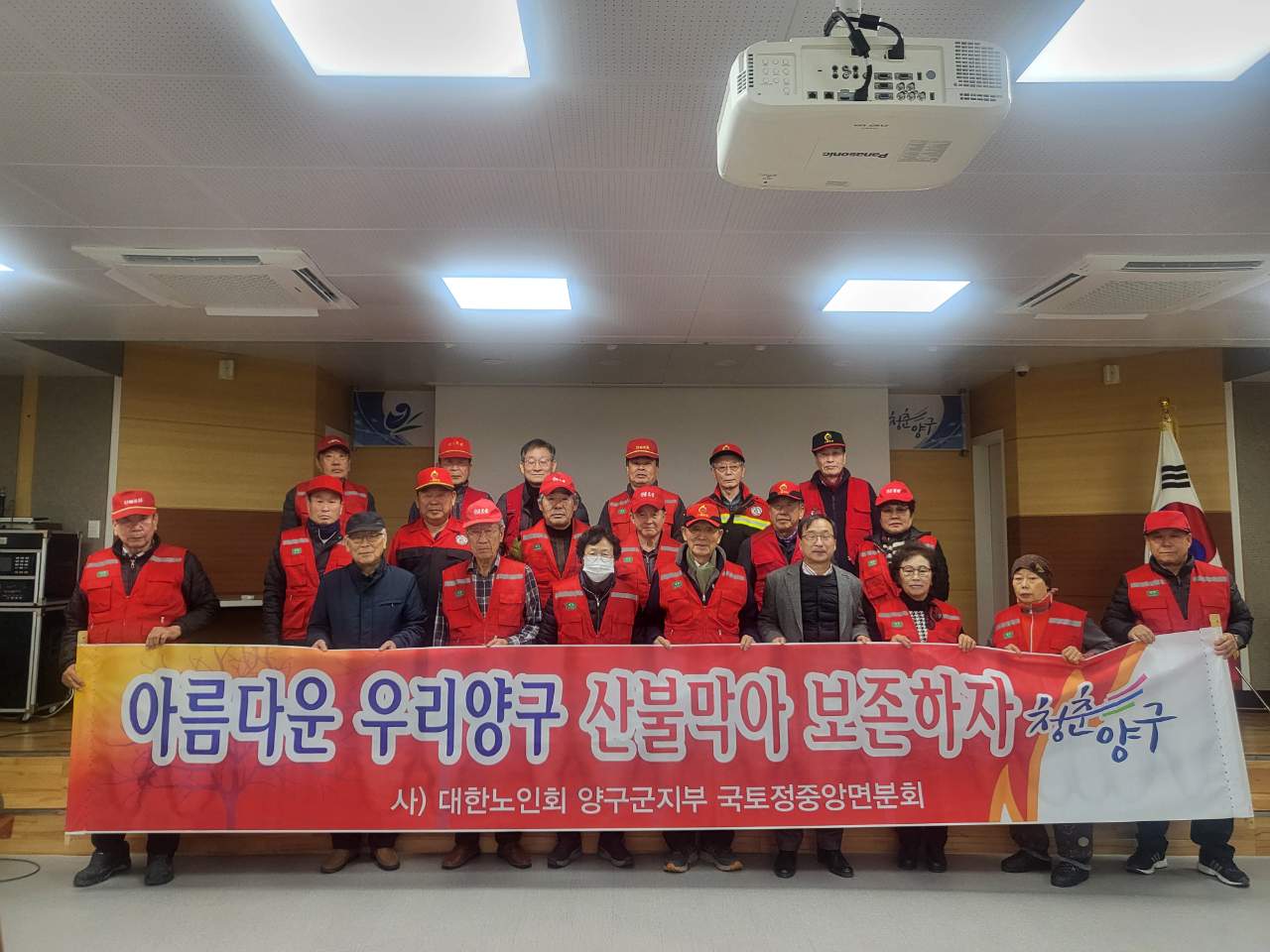 대한노인회 양구군지부 국토정중앙면분회는 22개리 노인회 회원들을 중심으로 2월 18일 봄철 산불 예방 활동을 위하여 발대식을 개최했다. 국토정중앙면분회에 봄철 산불조심기간 동안 입산통제 및 주민 보호 등 산불 예방 활동에 적극 참여할 예정이다.