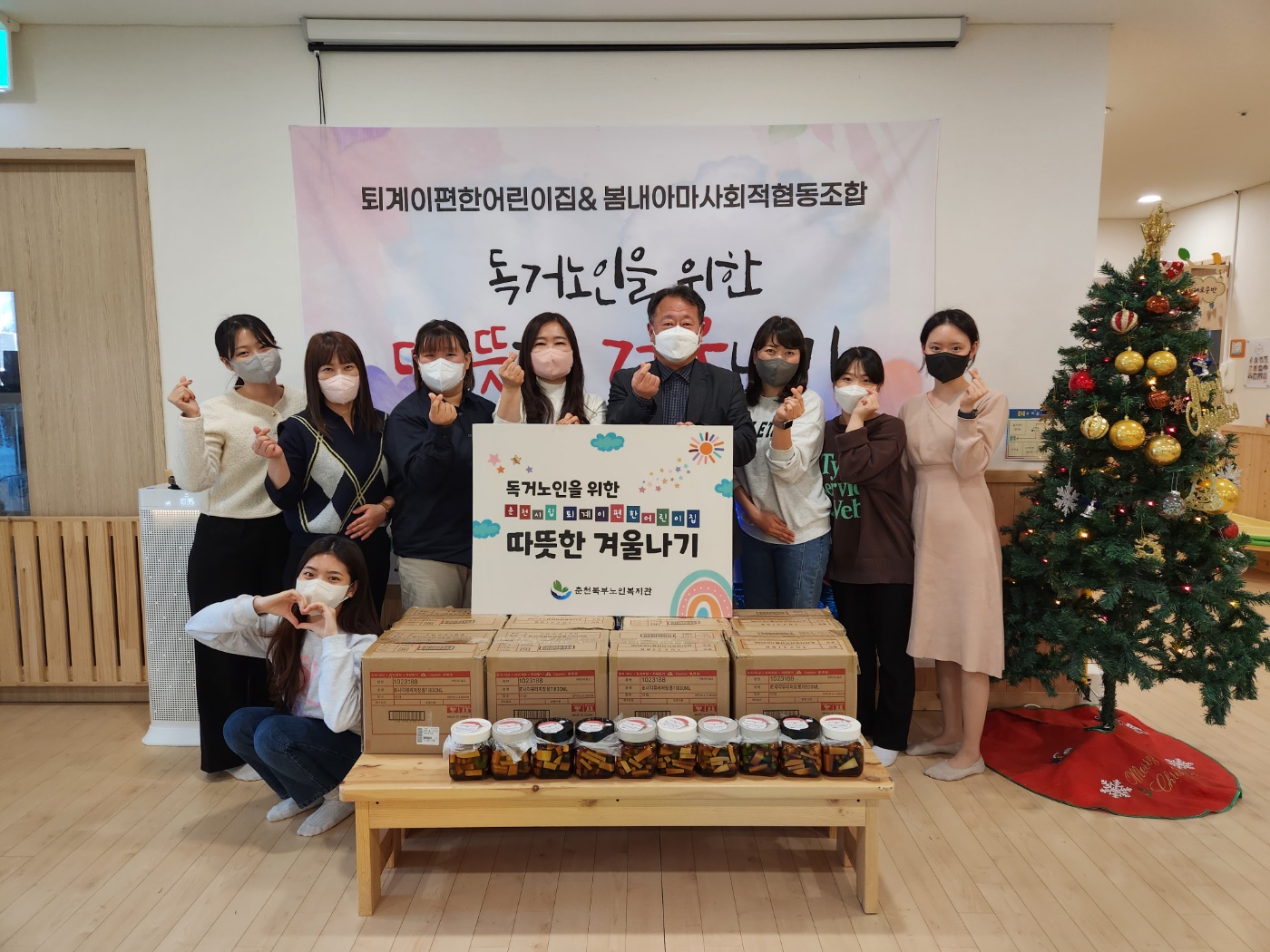 [강원사회복지신문 김도연 기자]=춘천 퇴계이편한어린이집&봄내아마사회적협동조합이 2022년 마지막을 독거노인분들에게 따뜻한 마음을 전하며 마무리했다. 평소 독거노인과 조손가정에 많은 관심을 갖고 지역사회에서 봉사와 후원으로 사랑을 전해온 퇴계이편한어린이집&봄내아마사회적협동조합은 연말에도 그 사랑...
