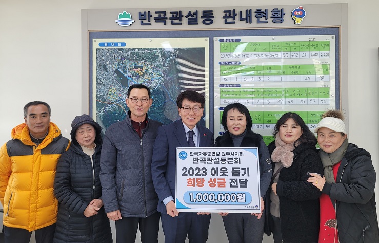 [강원사회복지신문 홍기한 기자]=성금 일백만원, 반곡관설동 거주 독거노인들에게 전달될 예정 한국자유총연맹원주시지회 반곡관설동분회(분회장 심미영)는 지난 12월 14일 원주시 반곡관설동 행정복지센터를 방문하여 관내 독거노인들을 위한 이웃돕기 성금을 전달했다. 이번 성금은 자유총연맹 반곡관설동 분회 회원들이 십...